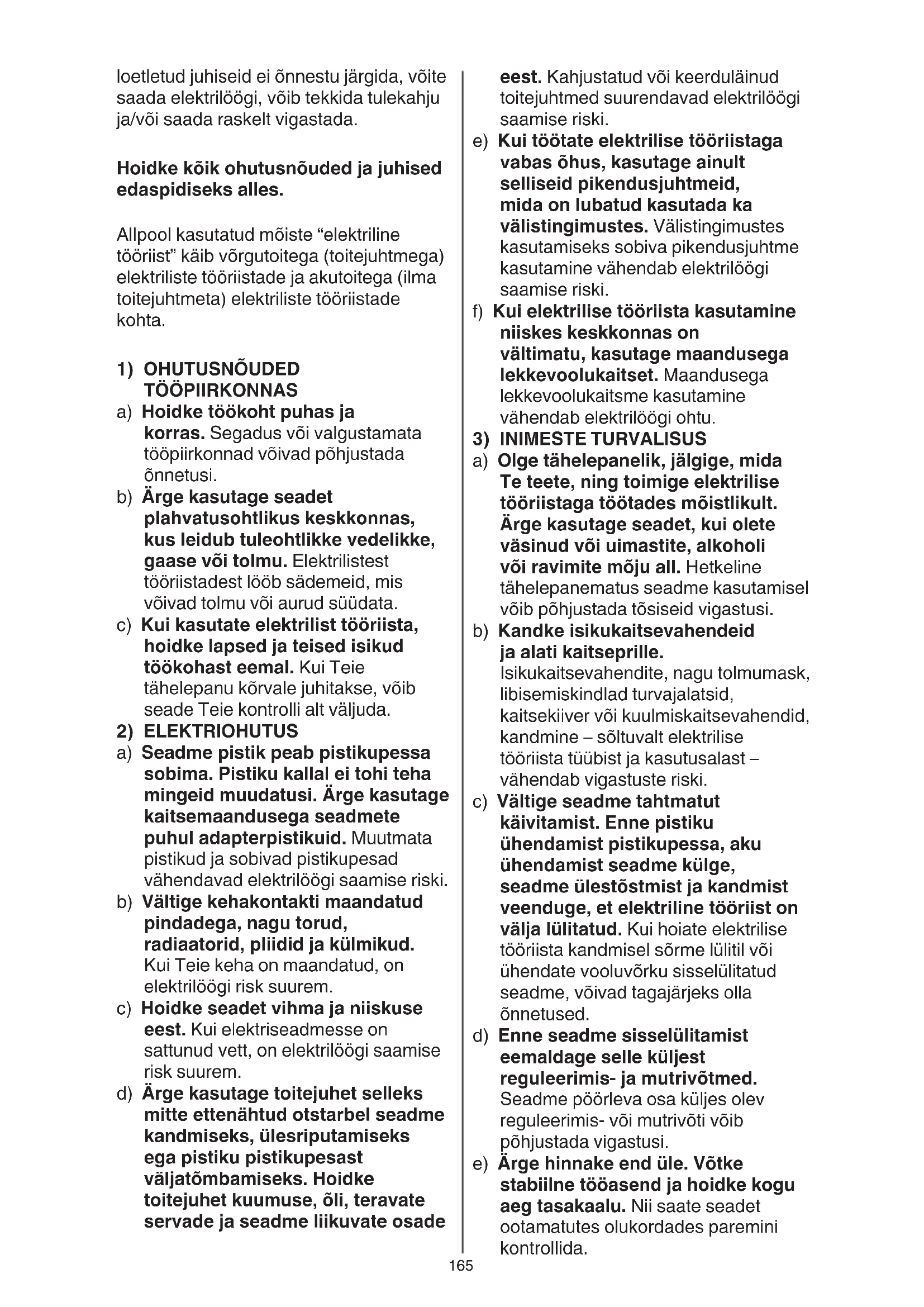 a) Seadme pistik peab pistikupessa sobima. Pistiku kallal ei tohi teha mingeid muudatusi. Ärge kasutage kaitsemaandusega seadmete puhul adapterpistikuid. Muutmata pistikud ja sobivad pistikupesad vähendavad elektrilöögi saamise riski. b) Vältige kehakontakti maandatud pindadega, nagu torud, radiaatorid, pliidid ja külmikud. Kui Teie keha on maandatud, on elektrilöögi risk suurem. c) Hoidke seadet vihma ja niiskuse eest. Kui elektriseadmesse on sattunud vett, on elektrilöögi saamise risk suurem. d) Ärge kasutage toitejuhet selleks mitte ettenähtud otstarbel seadme kandmiseks, ülesriputamiseks ega pistiku pistikupesast väljatõmbamiseks. Hoidke toitejuhet kuumuse, õli, teravate servade ja seadme liikuvate osade166 osad ei ole katki või sel määral kahjustatud, et võiksid mõjutada seadme töökindlust. Laske kahjustatud osad enne seadme kasutamist parandada. Paljude õnnetuste põhjuseks on halvasti hooldatud elektrilised tööriistad. f) Hoidke lõiketarvikud teravad ja puhtad. Hoolikalt hoitud, teravate lõikeservadega lõiketarvikud kiilduvad harvemini kinni ja neid on lihtsam juhtida. g) Kasutage elektrilist tööriista, lisavarustust, tarvikuid jne vastavalt siintoodud juhistele. Arvestage seejuures töötingimuste ja teostatava töö iseloomuga. Elektriliste tööriistade kasutamine mitte ettenähtud otstarbel võib põhjustada ohtlikke olukordi. h) Hoidke käepidemed ja haardepinnad kuiva ja puhtana ning vabana õlist ja määrdeainetest. Libedad käepidemed ja haardepinnad ei luba tööriista ohutult käsitseda ja ootamatutes olukordades kontrolli all hoida.