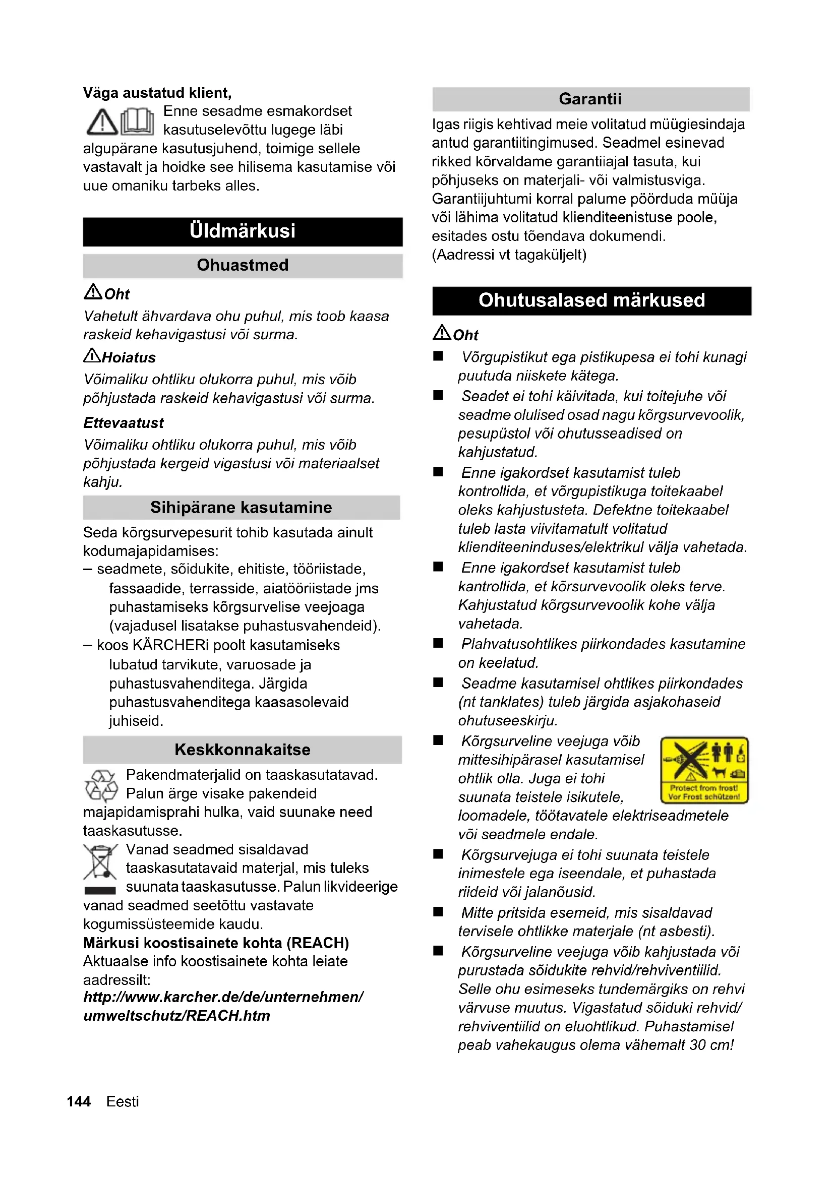 EN 55014–1: 2006 EN 55014–2: 1997 + A1: 2001 EN 60335–1 EN 60335–2–79 EN 61000–3–2: 2006 EN 61000–3–3: 2008 EN 62233: 2008 Приложен метод за оценка на съответствието: Приложение V ниво на шум dB(A) K 3.91 M Измерено:84 Гарантирано:85 K 4.91 M Измерено: 84 Гарантирано: 86 CEO Head of Approbation Български 143Deutsch 3 Väga austatud klient, Enne sesadme esmakordset kasutuselevõttu lugege läbi algupärane kasutusjuhend, toimige sellele vastavalt ja hoidke see hilisema kasutamise või uue omaniku tarbeks alles. Oht Vahetult ähvardava ohu puhul, mis toob kaasa raskeid kehavigastusi või surma. 몇 Hoiatus Võimaliku ohtliku olukorra puhul, mis võib põhjustada raskeid kehavigastusi või surma. Ettevaatust Võimaliku ohtliku olukorra puhul, mis võib põhjustada kergeid vigastusi või materiaalset kahju. Seda kõrgsurvepesurit tohib kasutada ainult kodumajapidamises: – seadmete, sõidukite, ehitiste, tööriistade, fassaadide, terrasside, aiatööriistade jms puhastamiseks kõrgsurvelise veejoaga (vajadusel lisatakse puhastusvahendeid). – koos KÄRCHERi poolt kasutamiseks lubatud tarvikute, varuosade ja puhastusvahenditega. Järgida puhastusvahenditega kaasasolevaid juhiseid. Pakendmaterjalid on taaskasutatavad. Palun ärge visake pakendeid majapidamisprahi hulka, vaid suunake need taaskasutusse. Vanad seadmed sisaldavad taaskasutatavaid materjal, mis tuleks suunata taaskasutusse. Palun likvideerige vanad seadmed seetõttu vastavate kogumissüsteemide kaudu. Märkusi koostisainete kohta (REACH) Aktuaalse info koostisainete kohta leiate aadressilt: http://www.karcher.de/de/unternehmen/ umweltschutz/REACH.htm Igas riigis kehtivad meie volitatud müügiesindaja antud garantiitingimused. Seadmel esinevad rikked kõrvaldame garantiiajal tasuta, kui põhjuseks on materjali- või valmistusviga. Garantiijuhtumi korral palume pöörduda müüja või lähima volitatud klienditeenistuse poole, esitades ostu tõendava dokumendi. (Aadressi vt tagaküljelt) Oht Võrgupistikut ega pistikupesa ei tohi kunagi puutuda niiskete kätega. Seadet ei tohi käivitada, kui toitejuhe või seadme olulised osad nagu kõrgsurvevoolik, pesupüstol või ohutusseadised on kahjustatud. Enne igakordset kasutamist tuleb kontrollida, et võrgupistikuga toitekaabel oleks kahjustusteta. Defektne toitekaabel tuleb lasta viivitamatult volitatud klienditeeninduses/elektrikul välja vahetada. Enne igakordset kasutamist tuleb kantrollida, et kõrsurvevoolik oleks terve. Kahjustatud kõrgsurvevoolik kohe välja vahetada. Plahvatusohtlikes piirkondades kasutamine on keelatud. Seadme kasutamisel ohtlikes piirkondades (nt tanklates) tuleb järgida asjakohaseid ohutuseeskirju. Kõrgsurveline veejuga võib mittesihipärasel kasutamisel ohtlik olla. Juga ei tohi suunata teistele isikutele, loomadele, töötavatele elektriseadmetele või seadmele endale. Kõrgsurvejuga ei tohi suunata teistele inimestele ega iseendale, et puhastada riideid või jalanõusid. Mitte pritsida esemeid, mis sisaldavad tervisele ohtlikke materjale (nt asbesti). Kõrgsurveline veejuga võib kahjustada või purustada sõidukite rehvid/rehviventiilid. Selle ohu esimeseks tundemärgiks on rehvi värvuse muutus. Vigastatud sõiduki rehvid/ rehviventiilid on eluohtlikud. Puhastamisel peab vahekaugus olema vähemalt 30 cm! Üldmärkusi Ohuastmed Sihipärane kasutamine Keskkonnakaitse Garantii Ohutusalased märkused 144 Eesti4 Deutsch Mitte kunagi ei tohi seadmesse imeda lahusteid sisaldavat vedelikku või lahjendamata happeid ja lahusteid! Selliste ainete hulka kuuluvad nt bensiin, värvivedeldi ja kütteõli. Pihustumisel tekkiv udu on eriti tuleohtlik, plahvatusohtlik ja mürgine. Mitte kasutada atsetooni, lahjendamata happeid ja lahusteid, sest need söövitavad seadmes kasutatud materjale. 몇 Hoiatus Toitepistik ja pikenduskaabli ühendus peavad olema veekindlad ega tohi lebada vees. Ebasobivad pikendusjuhtmed võivad olla ohtlikud. Välistingimustes võib kasutada ainult väljas kasutamiseks lubatud ja vastavalt tähistatud piisava ristlõikepinnaga pikendusjuhtmeid: 1 - 10 m: 1,5 mm