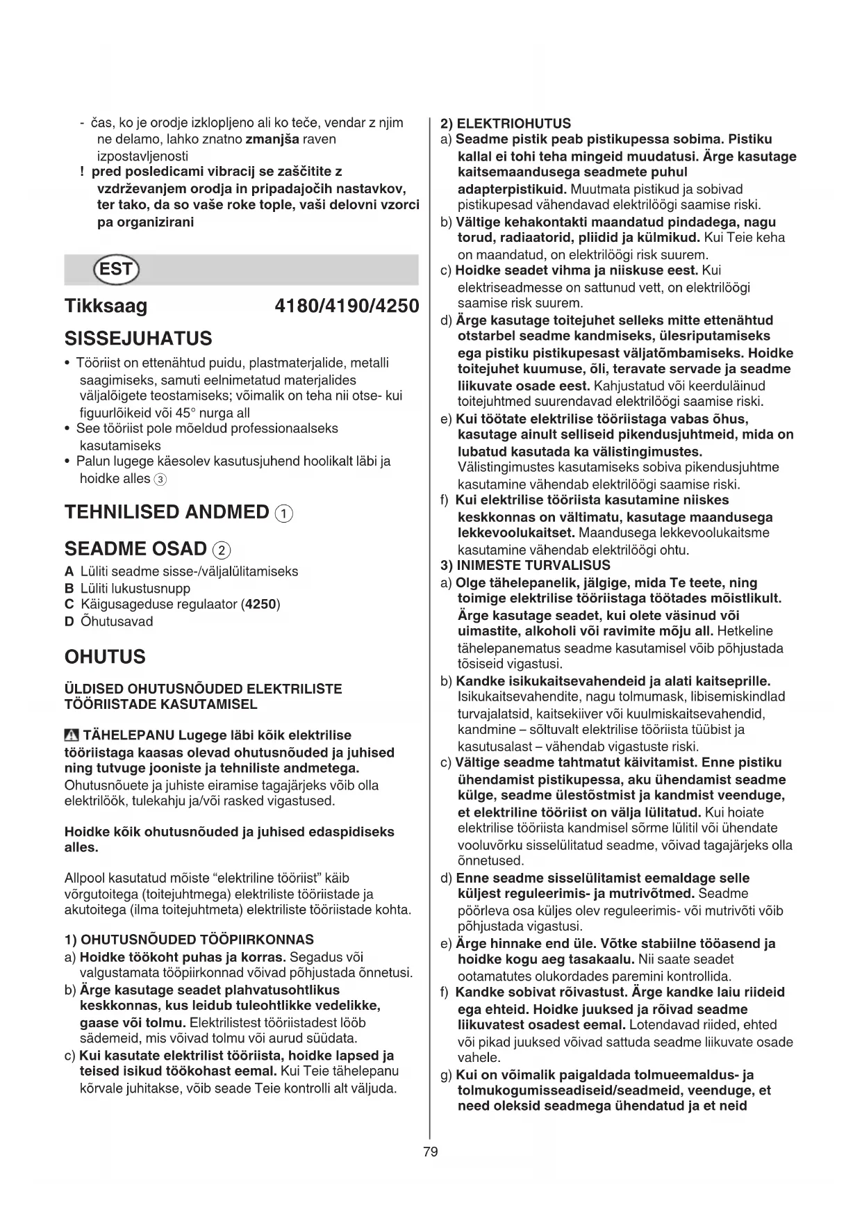 - Palun lugege käesolev kasutusjuhend hoolikalt läbi ja hoidke alles 3 TEHNILISED ANDMED 1 SEADME OSAD 2 A Lüliti seadme sisse-/väljalülitamiseks B Lüliti lukustusnupp C Käigusageduse regulaator (4250) D Õhutusavad OHUTUS