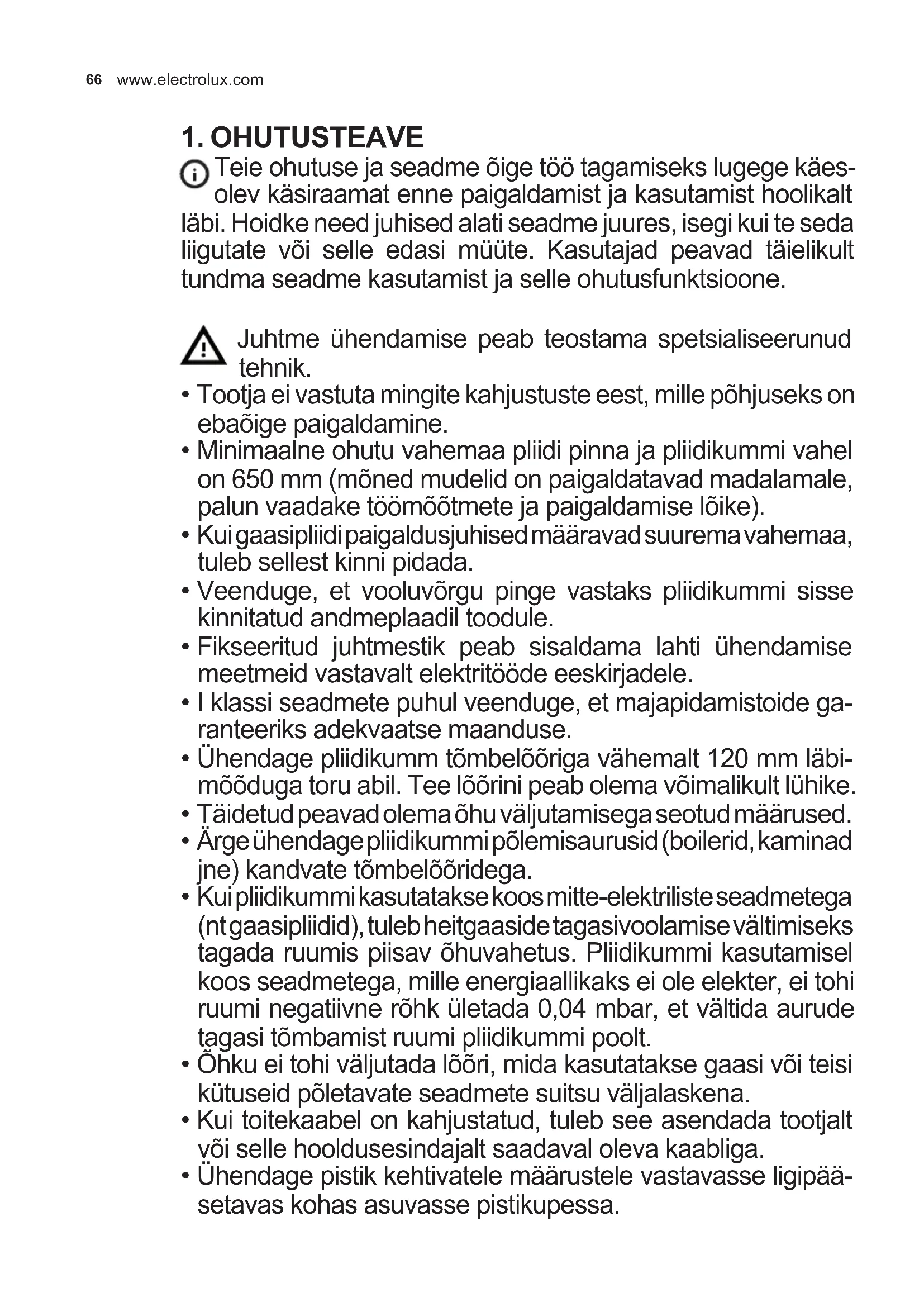 - Kui pliidikummi kasutatakse koos mitte-elektriliste seadmetega (nt gaasipliidid), tuleb heitgaaside tagasivoolamise vältimiseks tagada ruumis piisav õhuvahetus. Pliidikummi kasutamisel koos seadmetega, mille energiaallikaks ei ole elekter, ei tohi ruumi negatiivne rõhk ületada 0,04 mbar, et vältida aurude tagasi tõmbamist ruumi pliidikummi poolt.