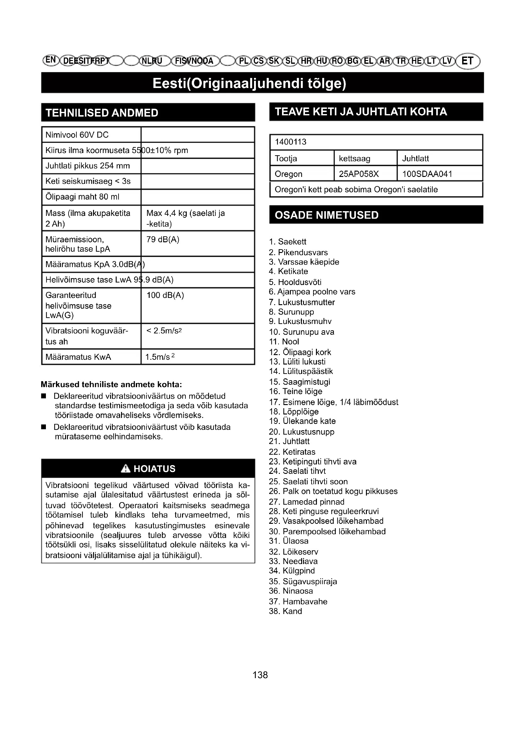 1400113Tootja kettsaag JuhtlattOregon 25AP058X 100SDAA041Oregon'i kett peab sobima Oregon'i saelatile OSADE NIMETUSED 1. Saekett2. Pikendusvars3. Varssae käepide4. Ketikate5. Hooldusvõti6. Ajampea poolne vars7. Lukustusmutter8. Surunupp9. Lukustusmuhv10. Surunupu ava11. Nool12. Õlipaagi kork13. Lüliti lukusti14. Lülituspäästik15. Saagimistugi16. Teine lõige17. Esimene lõige, 1/4 läbimõõdust18. Lõpplõige19. Ülekande kate20. Lukustusnupp21. Juhtlatt22. Ketiratas23. Ketipinguti tihvti ava24. Saelati tihvt25. Saelati tihvti soon26. Palk on toetatud kogu pikkuses27. Lamedad pinnad28. Keti pinguse reguleerkruvi29. Vasakpoolsed lõikehambad30. Parempoolsed lõikehambad31. Ülaosa32. Lõikeserv33. Neediava34. Külgpind35. Sügavuspiiraja36. Ninaosa37. Hambavahe38. Kand 138Eesti(Originaaljuhendi tõlge)