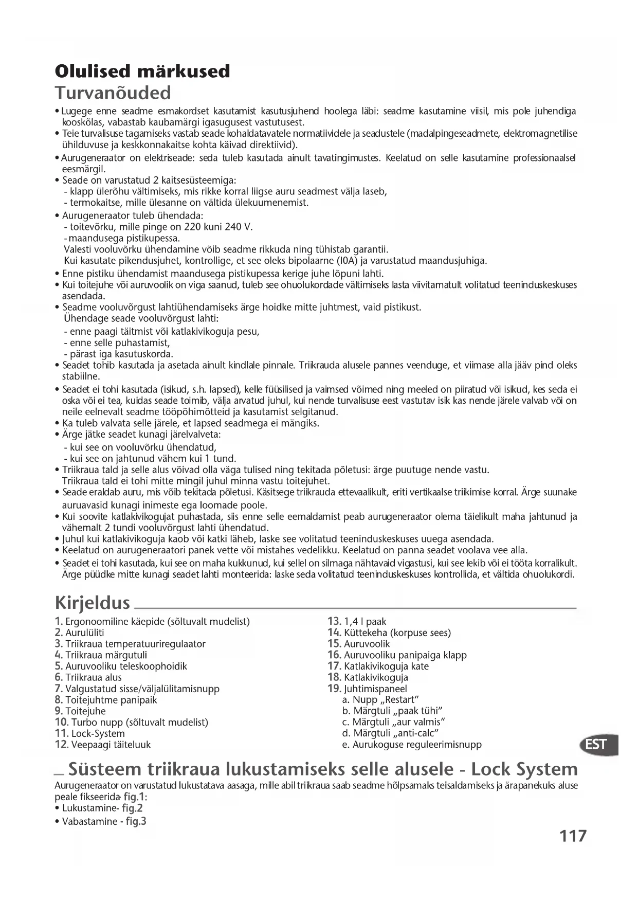 - Seadet ei tohi kasutada, kui see on maha kukkunud, kui sellel on silmaga nähtavaid vigastusi, kui see lekib või ei tööta korralikult. Ärge püüdke mitte kunagi seadet lahti monteerida: laske seda volitatud teeninduskeskuses kontrollida, et vältida ohuolukordi. 1. Ergonoomiline käepide (sõltuvalt mudelist)2. Aurulüliti3. Triikraua temperatuuriregulaator4. Triikraua märgutuli5. Auruvooliku teleskoophoidik6. Triikraua alus7. Valgustatud sisse/väljalülitamisnupp8. Toitejuhtme panipaik9. Toitejuhe10. Turbo nupp (sõltuvalt mudelist)11. Lock-System12. Veepaagi täiteluuk 13. 1,4 l paak14. Küttekeha (korpuse sees)15. Auruvoolik16. Auruvooliku panipaiga klapp17. Katlakivikoguja kate18. Katlakivikoguja19. Juhtimispaneela. Nupp „Restart”b. Märgtuli „paak tühi”c. Märgtuli „aur valmis“d. Märgtuli „anti-calc”e. Aurukoguse reguleerimisnupp Kirjeldus Süsteem triikraua lukustamiseks selle alusele - Lock System Aurugeneraator on varustatud lukustatava aasaga, mille abil triikraua saab seadme hõlpsamaks teisaldamiseks ja ärapanekuks aluse peale fikseerida - fig.1:• Lukustamine - fig.2• Vabastamine - fig.3 1800115593 TEFAL ExpressAnticalc:1800115593 5/02/09 11:38 Page 117118 Seadme kandmiseks triikraua käepidemest hoides:- asetage triikraud selle alusele aurugeneraatori peal ning tõmmake aasa ülespoole, kuni seepaigale lukustub (sellest annab märku klõpsatus) - fig.2. - Nüüd saab triikraua käepidemest hoides teisaldada kogu seadet
