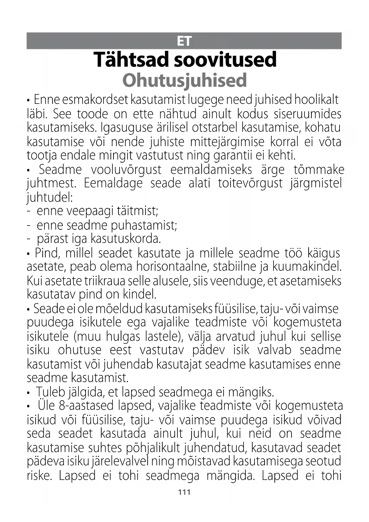 - Seade ei ole mõeldud kasutamiseks füüsilise, taju- või vaimse puudega isikutele ega vajalike teadmiste või kogemusteta isikutele (muu hulgas lastele), välja arvatud juhul kui sellise isiku ohutuse eest vastutav pädev isik valvab seadme kasutamist või juhendab kasutajat seadme kasutamises enne seadme kasutamist.
