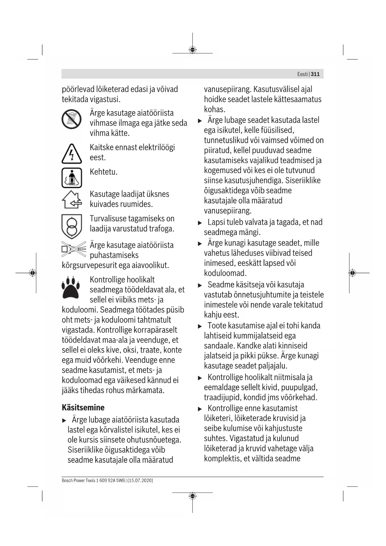 Kako bi se produljilo vrijeme rada, moguće je nabaviti dodatan akumulator od ovlaštene servisne službe za vrtne uređaje tvrtke Bosch. Otklanjanje pogrešaka Simptom Mogući uzrok Rješenje Motor se ne pokreće Unutarnje ožičenje vrtnog uređaja je neispravno Obratite se servisnoj službi tvrtke Bosch Akumulator je ispražnjen Napunite akumulator Akumulator je suviše hladan/topao Pustite akumulator da se zagrije/ohladi Trava je preduga Maksimalno dopuštena visina trave je 30 cm s najvišom postavkom visine rezanja Motorna zaštita se aktivirala Pustite motor da se ohladi i namjestite veću visinu rezanja 1 609 92A 5WB | (15.07.2020) Bosch Power ToolsHrvatski | 309 Simptom Mogući uzrok Rješenje Prekidač strujnog kruga nije ispravno/potpuno umetnut Ispravno umetnite Vrtni uređaj radi s prekidima Unutarnje ožičenje vrtnog uređaja je neispravno Obratite se servisnoj službi tvrtke Bosch Motorna zaštita se aktivirala Pustite motor da se ohladi i namjestite veću visinu rezanja Vrtni uređaj ostavlja nepravilan uzorak rezanja i/ili motor radi teško Visina rezanja je premala Namjestite veću visinu rezanja Nož je tup Zamijenite nož (vidi sliku K) Moguća su blokiranja Isključite vrtni uređaj i otpustite prekidač strujnog kruga Provjerite donju stranu vrtnog uređaja i po potrebi je oslobodite (uvijek nosite vrtne rukavice) Nož je pogrešno montiran Ispravno montirajte nož Nakon uključivanja vrtnog uređaja nož se ne vrti Trava ometa nož Isključite vrtni uređaj i otpustite prekidač strujnog kruga Uklonite začepljenje (uvijek nosite vrtne rukavice) Matica/vijak noža su otpušteni Pritegnite maticu/vijak noža (27Nm) Jake vibracije/buka Matica/vijak noža su otpušteni Pritegnite maticu/vijak noža (27Nm) Nož je oštećen Zamijenite nož (vidi sliku K) Akumulator i punjač Simptomi Mogući uzrok Rješenje Na punjaču treperi crveni pokazivač punjenja akumulatora Postupak punjenja nije moguć Akumulator nije (ispravno) umetnut Ispravno stavite akumulator na punjač Kontakti akumulatora su onečišćeni Očistite kontakte akumulatora, npr. višekratnim umetanjem i vađenjem akumulatora, po potrebi zamijenite akumulator Akumulator je neispravan Zamijenite akumulator Na punjaču ne svijetle pokazivači punjenja akumulatora Mrežni utikač punjača nije (ispravno) utaknut Utaknite mrežni utikač (potpuno) u utičnicu Utičnica, mrežni kabel ili punjač su neispravni Provjerite mrežni napon, po potrebi zatražite od ovlaštenog servisnog centra za električne alate tvrtke Bosch da obavi provjeru Održavanje i servisiranje Njegovanje akumulatora u Pozor! Prije obavljanja radova održavanja ili čišćenja isključite vrtni uređaj, otpustite prekidač strujnog kruga i izvadite akumulator te sabirnu košaru za travu. u Kada rukujete ili radite na području oštrih noževa uvijek nosite vrtne rukavice. Kako bi se zajamčilo optimalno iskorištavanje akumulatora, pridržavajte se sljedećih napomena i mjera: – Zaštitite akumulator od vlage i vode. – Skladištite vrtni uređaj i akumulator samo u rasponu temperature od –20 °C do 50 °C. Ne ostavljajte akumulator npr. ljeti u automobilu. – Skladištite akumulator odvojeno i ne u vrtnom uređaju. – U slučaju izravnog sunčanog zračenja ne ostavljajte akumulator u vrtnom uređaju. – Optimalna temperatura za čuvanje akumulatora je 5 °C. – Povremeno čistite ventilacijske proreze akumulatora mekim, čistim i suhim kistom. Znatno skraćeno vrijeme rada nakon punjenja ukazuje na to da je akumulator istrošen i da ga je potrebno zamijeniti. Servisna služba i savjeti o uporabi Naša servisna služba će odgovoriti na vaša pitanja o popravku i održavanju vašeg proizvoda, kao i o rezervnim dijelovima. Crteže u rastavljenom obliku i informacije o rezervnim dijelovima možete naći i na našoj adresi: www.bosch-pt.com Tim Bosch savjetnika o uporabi rado će odgovoriti na vaša pitanja o našim proizvodima i njihovom priboru. U slučaju upita ili naručivanja rezervnih dijelova, molimo vas obavezno navedite 10‑znamenkasti kataloški broj s tipske pločice proizvoda. Bosch Power Tools 1 609 92A 5WB | (15.07.2020)310 | Eesti Hrvatski Robert Bosch d.o.o PT/SHR-BSC Kneza Branimira 22 10040 Zagreb Tel.: +385 12 958 051 Fax: +385 12 958 050 E-Mail: RBKN-bsc@hr.bosch.com www.bosch.hr Ostale adrese servisa možete pronaći na: www.bosch-pt.com/serviceaddresses Transport Li-ionske aku-baterije ugrađene u električnom alatu podliježu zakonu o transportu opasnih tvari. Aku-baterije korisnik može bez ikakvih preduvjeta transportirati cestovnim transportom. Kod transporta na neki drugi način (npr.: zrakoplovom ili špedicijom) treba se pridržavati posebnih zahtjeva na ambalažu i označavanje. Kod pripreme pošiljke za transport treba zatražiti savjet stručnjaka za transport opasnih tvari. Aku-baterije transportirajte ako njihovo kućište nije oštećeno. Oblijepite otvorene kontakte i zapakirajte aku- bateriju tako da se ne može pomicati u ambalaži. Molimo pridržavajte se i eventualnih dodatnih nacionalnih propisa. Zbrinjavanje Vrtne uređaje, akumulatore, pribor i pakiranja potrebno je odnijeti na ekološko recikliranje. Ne bacajte vrtne uređaje i akumulatore/baterije u kućni otpad! Samo za zemljeEU: U skladu s Europskom direktivom 2012/19/EU električne i elektroničke uređaje, a u skladu s Europskom direktivom 2006/66/EZ neispravne ili iskorištene akumulatore/baterije potrebno je odvojeno prikupiti i odnijeti na ekološko recikliranje. Aku-baterije/baterije: Li-Ion: Molimo pridržavajte se napomena u odjeljku Transport. Eesti Ohutusnõuded Tähelepanu! Lugege järgmised juhised tähelepanelikult läbi. Tutvuge aiatööriista ja selle juhtkomponentide nõuetekohase kasutusega. Hoidke kasutusjuhend hilisemaks kasutamiseks hoolikalt alles. Aiatööriistal olevate sümbolite selgitus Üldine oht. Lugege kasutusjuhend läbi. Veenduge, et eemale paiskuvad võõrkehad ei vigasta läheduses viibivaid inimesi. Ho