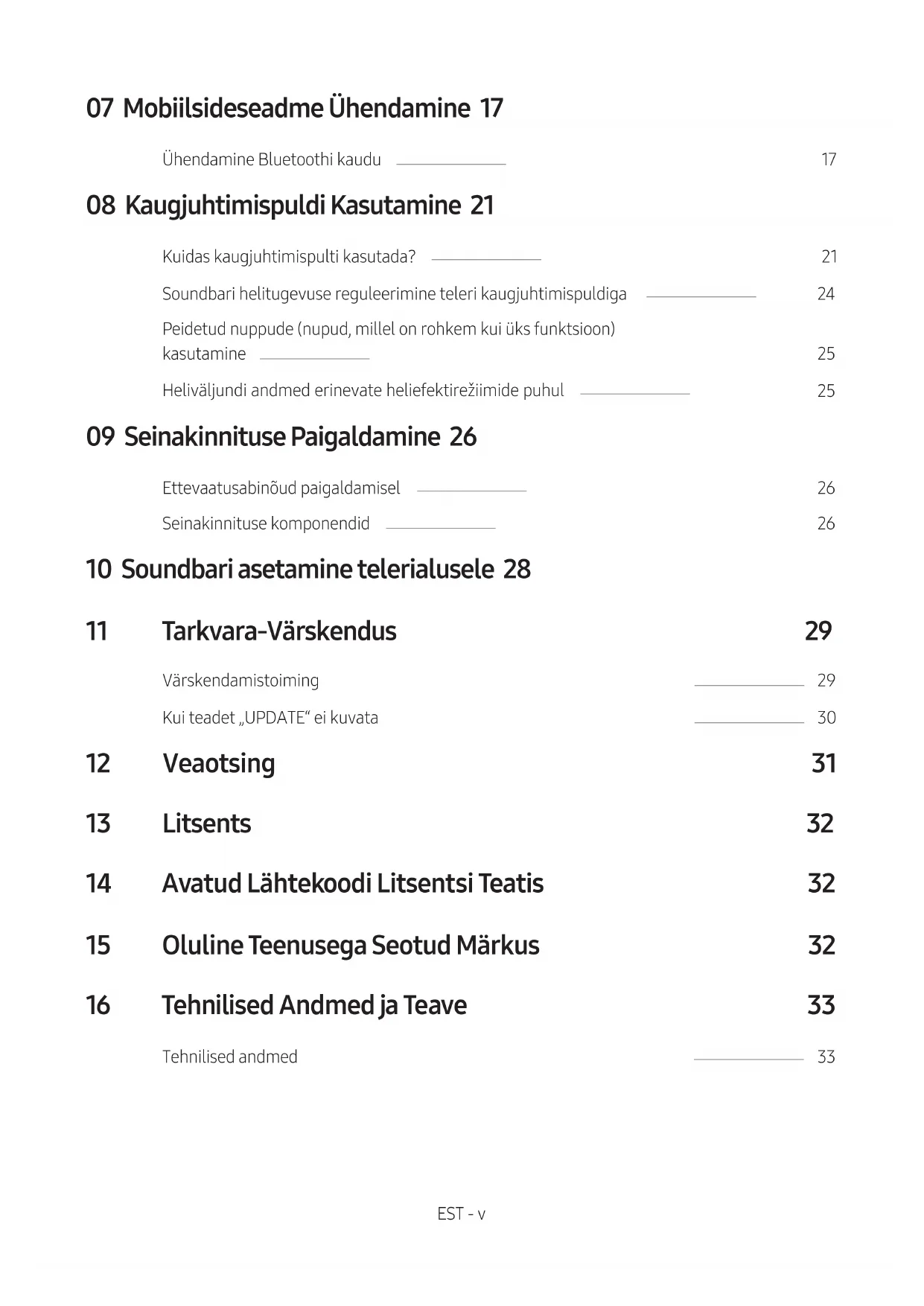 - USB kaudu värskendamine ei pruugi olenevalt mäluseadme tootjast saadaval olla.EST - 31 12 VEAOTSING Enne hoolduse taotlemist kontrollige järgmist. Seade ei lülitu sisse. Kas toitekaabel on kindlalt seinakontakti ja toiteadapteriga ühendatud? ; Ühendage toitekaabel seinakontaktist ja toiteadapterist lahti ning ühendage see uuesti tagamaks, et ühendus on kindel. Kas toiteadapter on kindlalt põhiseadmega ühendatud? ; Ühendage toiteadapter Soundbari küljest lahti ja seejärel ühendage see uuesti tagamaks, et ühendus on kindel ja turvaline. Mõni funktsioon ei tööta nupu vajutamisel. Kas õhus on staatilist elektrit? ; Eemaldage toitepistik ja ühendage see uuesti. Režiimis BT esineb helikatkestusi. ; Vt Bluetooth-ühenduse jaotisi lk 12 ja