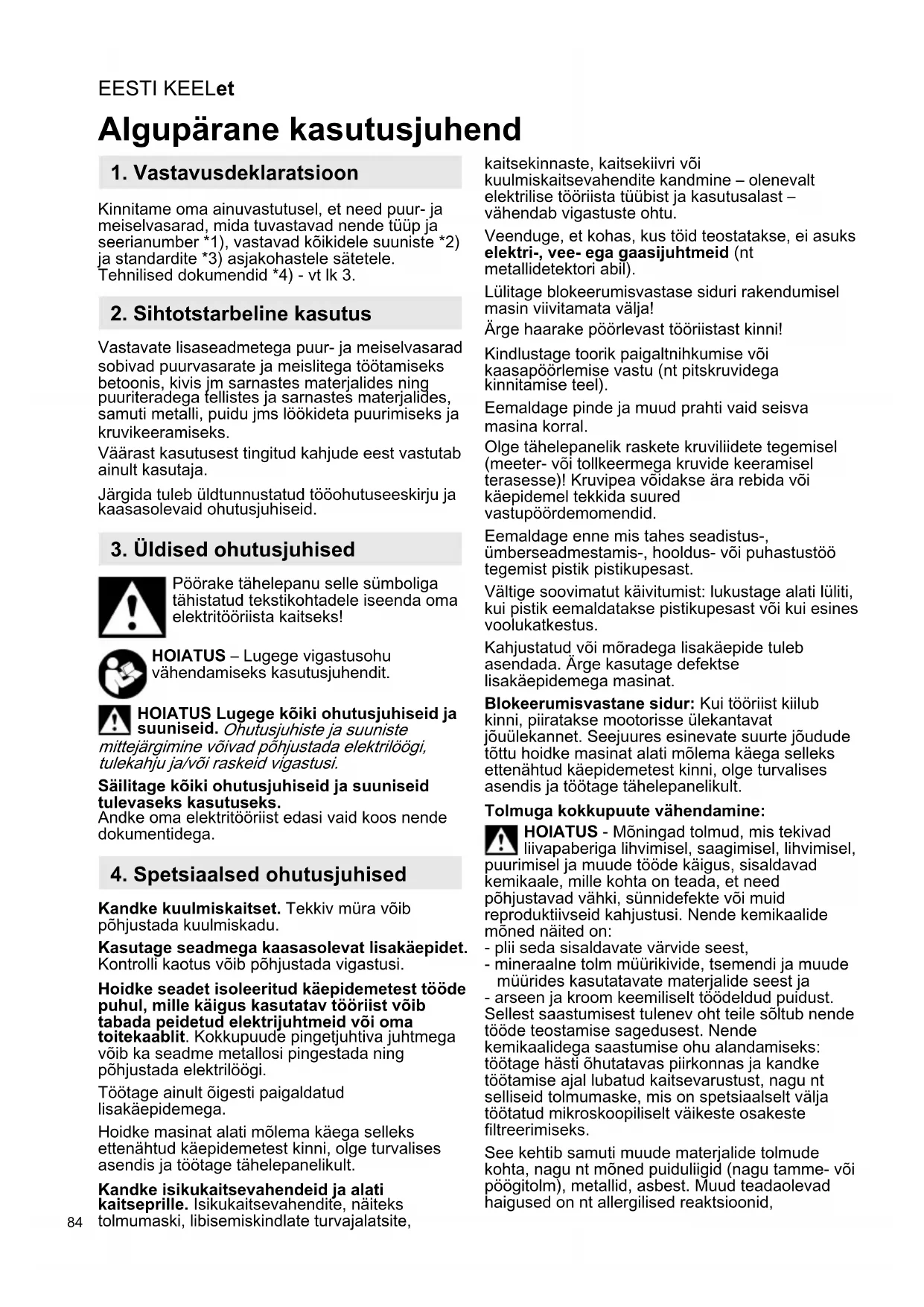 Kinnitame oma ainuvastutusel, et need puur- ja meiselvasarad, mida tuvastavad nende tüüp ja seerianumber *1), vastavad kõikidele suuniste *2) ja standardite *3) asjakohastele sätetele. Tehnilised dokumendid *4) - vt lk 3. Vastavate lisaseadmetega puur- ja meiselvasarad sobivad puurvasarate ja meislitega töötamiseks betoonis, kivis jm sarnastes materjalides ning puuriteradega tellistes ja sarnastes materjalides, samuti metalli, puidu jms löökideta puurimiseks ja kruvikeeramiseks. Väärast kasutusest tingitud kahjude eest vastutab ainult kasutaja. Järgida tuleb üldtunnustatud tööohutuseeskirju ja kaasasolevaid ohutusjuhiseid. Pöörake tähelepanu selle sümboliga tähistatud tekstikohtadele iseenda oma elektritööriista kaitseks! HOIATUS – Lugege vigastusohu vähendamiseks kasutusjuhendit. HOIATUS Lugege kõiki ohutusjuhiseid ja suuniseid. Ohutusjuhiste ja suuniste mittejärgimine võivad põhjustada elektrilöögi, tulekahju ja/või raskeid vigastusi. Säilitage kõiki ohutusjuhiseid ja suuniseid tulevaseks kasutuseks. Andke oma elektritööriist edasi vaid koos nende dokumentidega. Kandke kuulmiskaitset. Tekkiv müra võib põhjustada kuulmiskadu. Kasutage seadmega kaasasolevat lisakäepidet. Kontrolli kaotus võib põhjustada vigastusi. Hoidke seadet isoleeritud käepidemetest tööde puhul, mille käigus kasutatav tööriist võib tabada peidetud elektrijuhtmeid või oma toitekaablit. Kokkupuude pingetjuhtiva juhtmega võib ka seadme metallosi pingestada ning põhjustada elektrilöögi. Töötage ainult õigesti paigaldatud lisakäepidemega. Hoidke masinat alati mõlema käega selleks ettenähtud käepidemetest kinni, olge turvalises asendis ja töötage tähelepanelikult. Kandke isikukaitsevahendeid ja alati kaitseprille. Isikukaitsevahendite, näiteks tolmumaski, libisemiskindlate turvajalatsite, kaitsekinnaste, kaitsekiivri või kuulmiskaitsevahendite kandmine – olenevalt elektrilise tööriista tüübist ja kasutusalast – vähendab vigastuste ohtu. Veenduge, et kohas, kus töid teostatakse, ei asuks elektri-, vee- ega gaasijuhtmeid (nt metallidetektori abil). Lülitage blokeerumisvastase siduri rakendumisel masin viivitamata välja! Ärge haarake pöörlevast tööriistast kinni! Kindlustage toorik paigaltnihkumise või kaasapöörlemise vastu (nt pitskruvidega kinnitamise teel). Eemaldage pinde ja muud prahti vaid seisva masina korral. Olge tähelepanelik raskete kruviliidete tegemisel (meeter- või tollkeermega kruvide keeramisel terasesse)! Kruvipea võidakse ära rebida või käepidemel tekkida suured vastupöördemomendid. Eemaldage enne mis tahes seadistus-, ümberseadmestamis-, hooldus- või puhastustöö tegemist pistik pistikupesast. Vältige soovimatut käivitumist: lukustage alati lüliti, kui pistik eemaldatakse pistikupesast või kui esines voolukatkestus. Kahjustatud või mõradega lisakäepide tuleb asendada. Ärge kasutage defektse lisakäepidemega masinat. Blokeerumisvastane sidur: Kui tööriist kiilub kinni, piiratakse mootorisse ülekantavat jõuülekannet. Seejuures esinevate suurte jõudude tõttu hoidke masinat alati mõlema käega selleks ettenähtud käepidemetest kinni, olge turvalises asendis ja töötage tähelepanelikult. Tolmuga kokkupuute vähendamine: HOIATUS - Mõningad tolmud, mis tekivad liivapaberiga lihvimisel, saagimisel, lihvimisel, puurimisel ja muude tööde käigus, sisaldavad kemikaale, mille kohta on teada, et need põhjustavad vähki, sünnidefekte või muid reproduktiivseid kahjustusi. Nende kemikaalide mõned näited on: - plii seda sisaldavate värvide seest, - mineraalne tolm müürikivide, tsemendi ja muude müürides kasutatavate materjalide seest ja - arseen ja kroom keemiliselt töödeldud puidust. Sellest saastumisest tulenev oht teile sõltub nende tööde teostamise sagedusest. Nende kemikaalidega saastumise ohu alandamiseks: töötage hästi õhutatavas piirkonnas ja kandke töötamise ajal lubatud kaitsevarustust, nagu nt selliseid tolmumaske, mis on spetsiaalselt välja töötatud mikroskoopiliselt väikeste osakeste filtreerimiseks. See kehtib samuti muude materjalide tolmude kohta, nagu nt mõned puiduliigid (nagu tamme- või pöögitolm), metallid, asbest. Muud teadaolevad haigused on nt allergilised reaktsioonid, Algupärane kasutusjuhend
