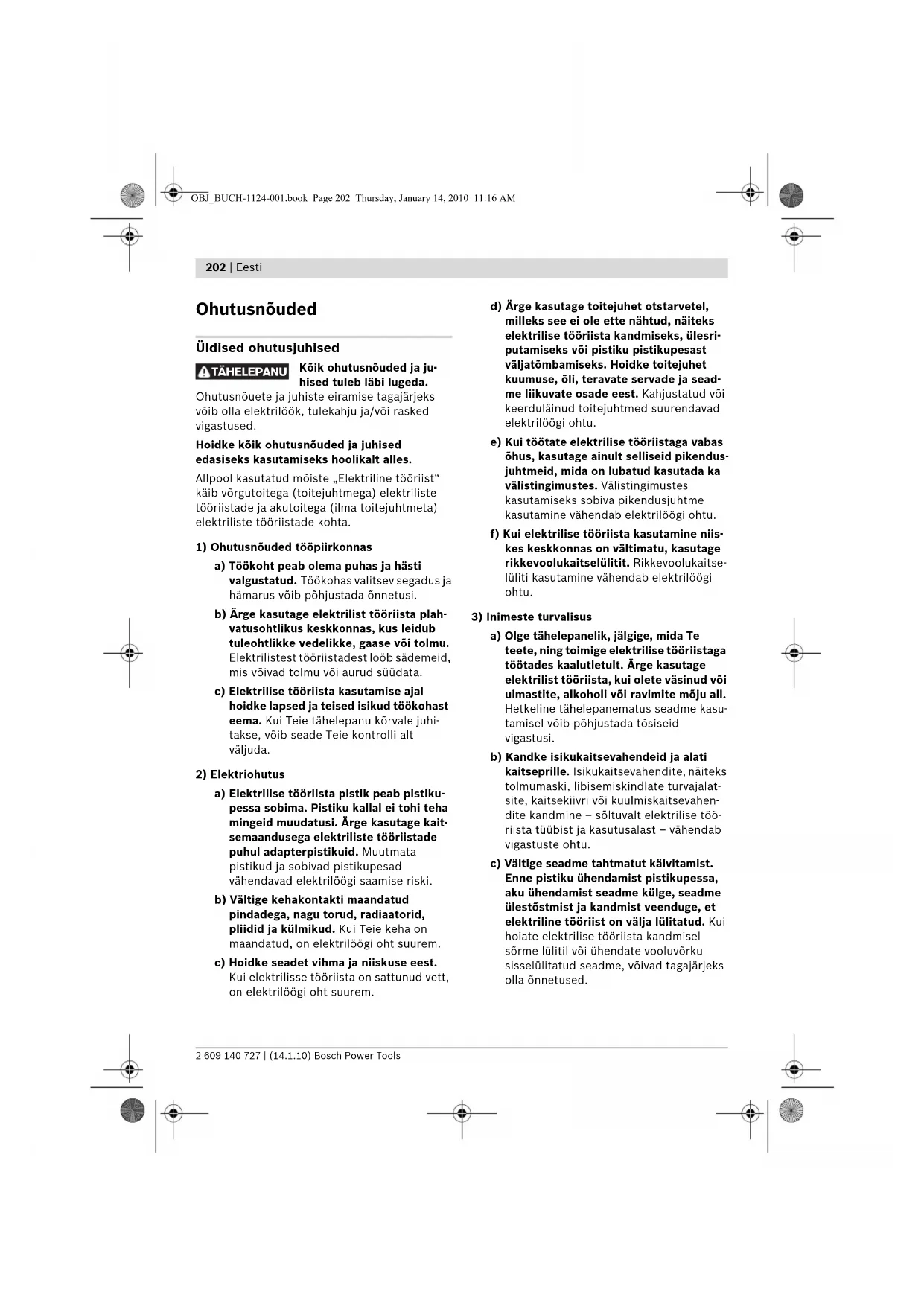 a) Olge tähelepanelik, jälgige, mida Te teete, ning toimige elektrilise tööriistaga töötades kaalutletult. Ärge kasutage elektrilist tööriista, kui olete väsinud või uimastite, alkoholi või ravimite mõju all. Hetkeline tähelepanematus seadme kasu- tamisel võib põhjustada tõsiseid vigastusi. b) Kandke isikukaitsevahendeid ja alati kaitseprille. Isikukaitsevahendite, näiteks tolmumaski, libisemiskindlate turvajalat- site, kaitsekiivri või kuulmiskaitsevahen- dite kandmine – sõltuvalt elektrilise töö- riista tüübist ja kasutusalast – vähendab vigastuste ohtu. c) Vältige seadme tahtmatut käivitamist. Enne pistiku ühendamist pistikupessa, aku ühendamist seadme külge, seadme ülestõstmist ja kandmist veenduge, et elektriline tööriist on välja lülitatud. Kui hoiate elektrilise tööriista kandmisel sõrme lülitil või ühendate vooluvõrku sisselülitatud seadme, võivad tagajärjeks olla õnnetused. TÄHELEPANU OBJ_BUCH-1124-001.book Page 202 Thursday, January 14, 2010 11:16 AMEesti | 203 Bosch Power Tools 2 609 140 727 | (14.1.10) d) Enne elektrilise tööriista sisselülitamist eemaldage selle küljest reguleerimis- ja mutrivõtmed. Seadme pöörleva osa küljes olev reguleerimis- või mutrivõti võib põhjustada vigastusi. e) Vältige ebatavalist kehaasendit. Võtke stabiilne tööasend ja hoidke kogu aeg tasakaalu. Nii saate elektrilist tööriista ootamatutes olukordades paremini kontrollida. f) Kandke sobivat rõivastust. Ärge kandke laiu riideid ega ehteid. Hoidke juuksed, rõivad ja kindad seadme liikuvatest osadest eemal. Lotendavad riided, ehted või pikad juuksed võivad sattuda seadme liikuvate osade vahele. g) Kui on võimalik paigaldada tolmueemal- dus- ja tolmukogumisseadiseid, veen- duge, et need on seadmega ühendatud ja et neid kasutatakse õigesti. Tolmu- eemaldusseadise kasutamine vähendab tolmust põhjustatud ohte.