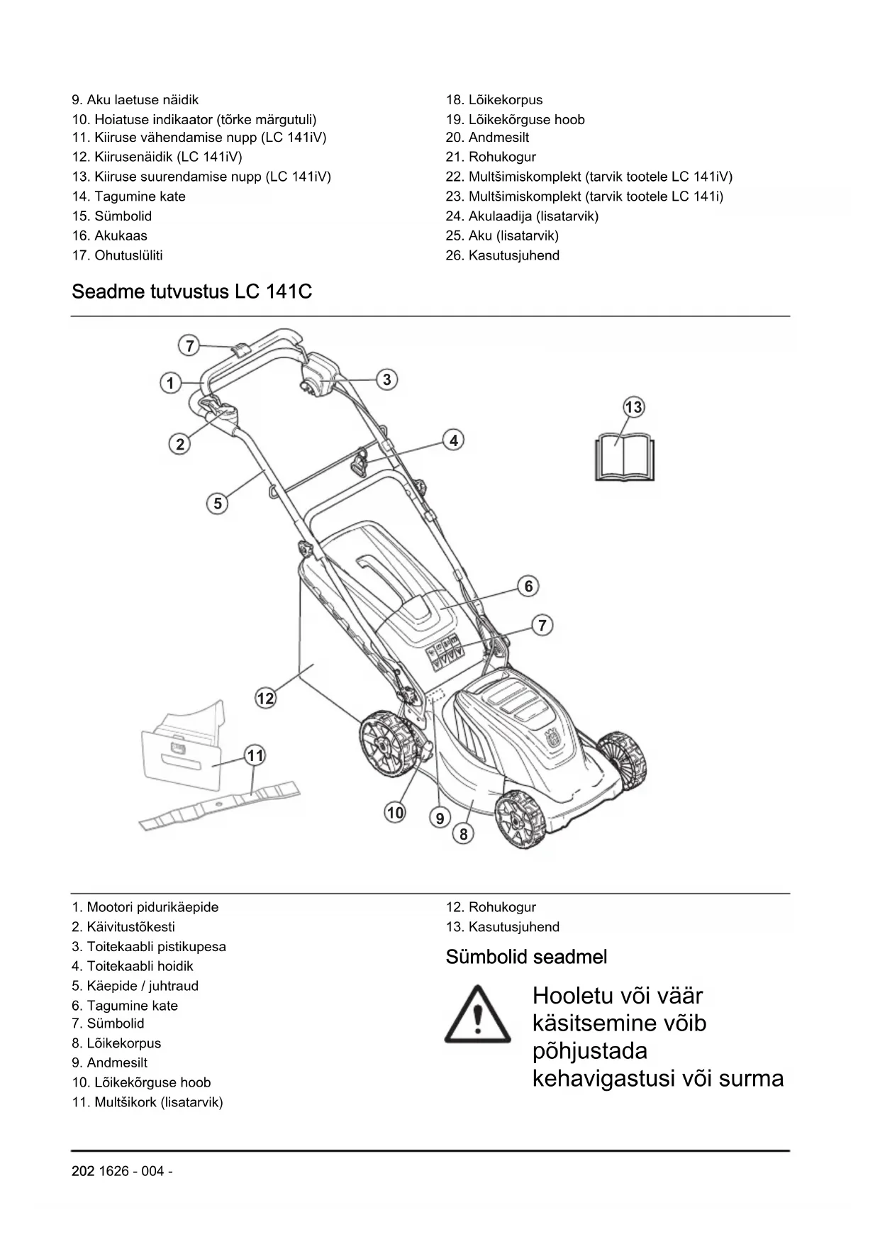 Sümbolid seadmel Hooletu või väär käsitsemine võib põhjustada kehavigastusi või surma 202 1626 - 004 -kasutajale või juuresolijaile. Enne seadme kasutamist lugege kasutusjuhend läbi ja veenduge, et oleksite juhistest aru saanud. Teised inimesed ja loomad peavad viibima tööalast ohutus kauguses. Olge ettevaatlik - lenduvad esemed ning tagasipõrkumise oht. Hoiatus! Hoidke käed ja jalad pöörlevast terast eemal. Hoiatus! Hoidke käed ja jalad pöörlevatest osadest eemal. Enne seadme hooldustööde alustamist eemaldage ohutuslüliti. (mudel LC 141iV/ LC 141i) Enne seadme hooldustööde alustamist lahutage see vooluvõrgust. (mudel LC 141C) IPX1 – seade on kaitstud tilkuva vee eest (mudel LC 141iV/ LC 141i) IPX4 – seade on kaitstud pritsiva vee eest (mudel LC 141C) Seadet ei tohi jätta vihma kätte (mudel LC 141iV/LC 141i) Hoiatus! Ärge sõitke seadmega üle toitekaabli, võite saada elektrilöögi või seadet kahjustada. (mudel LC 141C) Toode vastab ELi kehtivatele direktiividele. Ümbritsevasse keskkonda leviv müra vastavalt Euroopa Ühenduse direktiivile. Seadme müratase on ära toodud tehniliste andmete peatükis ja etiketil. Alalisvool. 36 V Topeltisolatsioon. 1626 - 004 - 203Toimetage seade elektri- ja elektroonika- jäätmete ring- lussevõtukes- kusesse. (Keh- tib vaid Euroo- pas) Mudeli LC 141iV/ LC 141i käivi- tusprotseduur: vajutage sisse- ja väljalülitus- nuppu, avage käivitustõkesti, vajutage moo- tori pidurikäepi- de alla. Mudeli LC 141C käivitusprotseduur: avage käivitustõkesti, vajutage mootori pidurikäepide alla. Seiskamiseks vabastage mootori pidurikäepide. Aeglane Kiire Skannitav kood Märkus: Ülejäänud seadmel toodud sümbolid/ tähised vastavad teatud riikides kehtivatele sertifitseerimisnõuetele. Tootevastutus Tootevastutusseaduste alusel ei vastuta me tootest tingitud kahjustuste eest, kui: