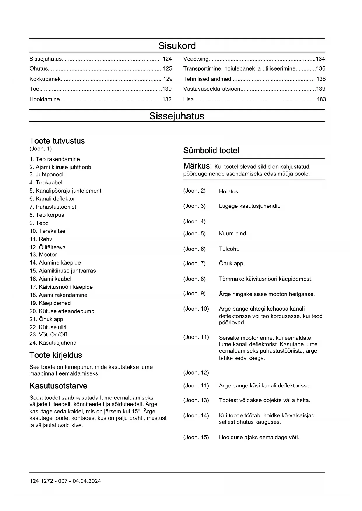 Toote kirjeldus See toode on lumepuhur, mida kasutatakse lume maapinnalt eemaldamiseks. Kasutusotstarve Seda toodet saab kasutada lume eemaldamiseks väljadelt, teedelt, kõnniteedelt ja sõiduteedelt. Ärge kasutage seda kaldel, mis on järsem kui 15°. Ärge kasutage toodet kohtades, kus on palju prahti, mustust ja väljaulatuvaid kive. Sümbolid tootel Märkus: Kui tootel olevad sildid on kahjustatud, pöörduge nende asendamiseks edasimüüja poole. (Joon. 2) Hoiatus. (Joon. 3) Lugege kasutusjuhendit. (Joon. 4) (Joon. 5) Kuum pind. (Joon. 6) Tuleoht. (Joon. 7) Õhuklapp. (Joon. 8) Tõmmake käivitusnööri käepidemest. (Joon. 9) Ärge hingake sisse mootori heitgaase. (Joon. 10) Ärge pange ühtegi kehaosa kanali deflektorisse või teo korpusesse, kui teod pöörlevad. (Joon. 11) Seisake mootor enne, kui eemaldate lume kanali deflektorist. Kasutage lume eemaldamiseks puhastustööriista, ärge tehke seda käega. (Joon. 12) (Joon. 11) Ärge pange käsi kanali deflektorisse. (Joon. 13) Tootest võidakse objekte välja heita. (Joon. 14) Kui toode töötab, hoidke kõrvalseisjad sellest ohutus kauguses. (Joon. 15) Hoolduse ajaks eemaldage võti. 124 1272 - 007 - 04.04.2024(Joon. 16) Seadke süütevõti asendisse RUN (KÄIVITUS). (Joon. 17) Keerake kütuselüliti asendisse (ON) SEES. (Joon. 18) Vajutage etteandepumpa. (Joon. 19) Kukkumisoht. (Joon. 20) Tagurdage aeglaselt. (Joon. 21) Kandke heakskiidetud kaitsekindaid. (Joon. 22) Kasutage kaitsekiivirit. Kandke heakskiidetud kõrvaklappe. Kandke heakskiidetud kaitseprille. (Joon. 23) Keskkonda paisatava müra tase vastab Euroopa direktiivi 2000/14/EÜ ja Uus Lõuna-Walesi seaduse „Protection of the Environment Operations (Noise Control) Regulation 2017“ nõuetele. Mürataseme andmed on toodud seadme sildil ja peatükis Tehnilised andmed. (Joon. 24) Toode vastab ELi kehtivatele direktiividele. (Joon. 25) See toode vastab kehtivatele UK direktiividele. Märkus: Ülejäänud seadmel toodud sümbolid/ tähised vastavad teatud riikides kehtivatele sertifitseerimisnõuetele. Euro V heitmed HOIATUS: Mootori igasugune modifitseerimine, muutmine või rikkumine tühistab toote EL-i tüübikinnituse. Tootja Husqvarna AB Drottninggatan 2, SE-561 82 Huskvarna Toote kahjustused Me ei vastuta meie tootele tekitatud kahjude eest, kui: