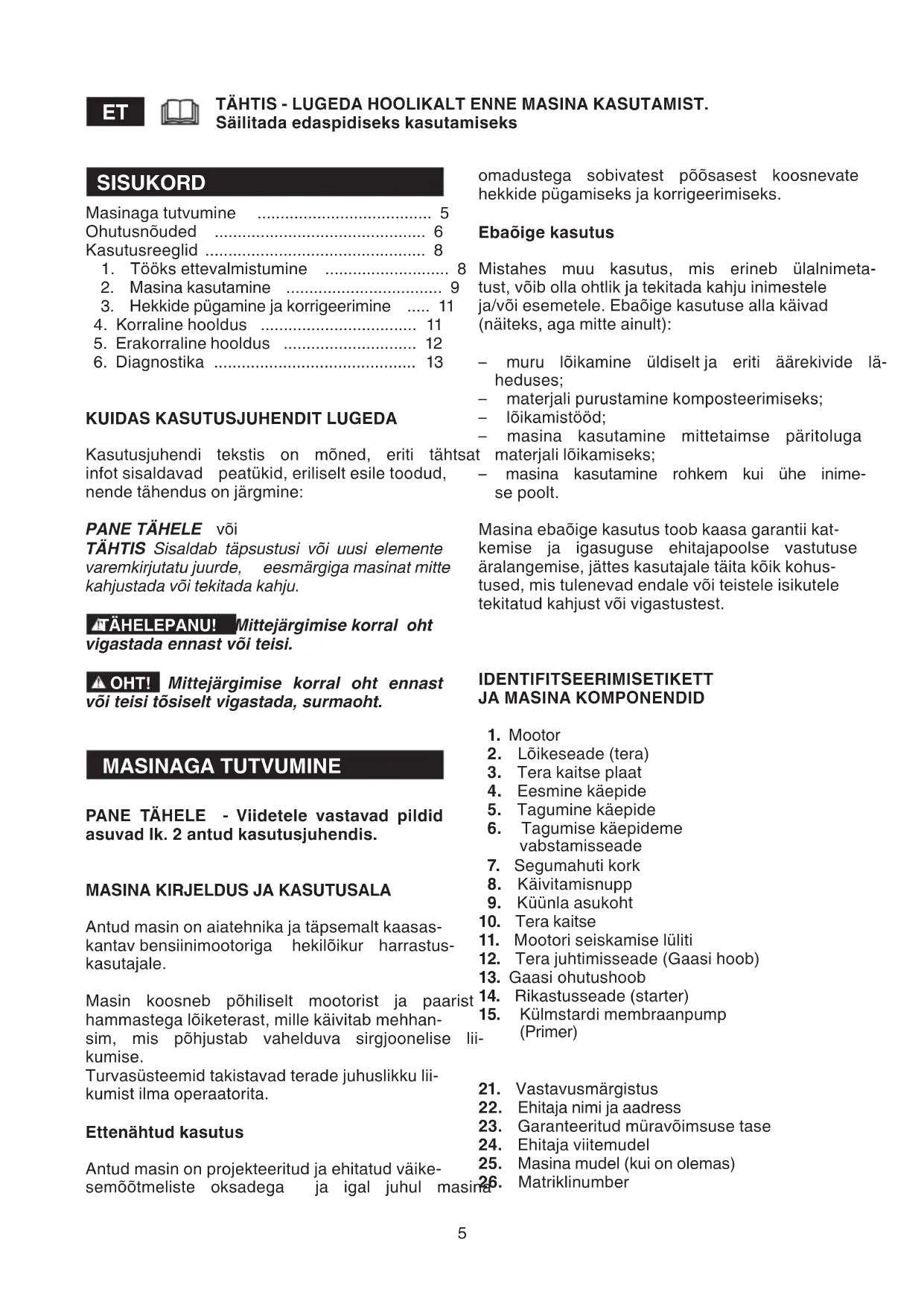 KAHJUSTUSI JA TÕSISEID VIGASTUSI. Lugeda tähelepanelikult juhiseid masina õigeks kasutuseks, ettevalmistuseks, hoolduseks, käi- vitamiseks ja seiskamiseks. Õppida tundma juh- timisseadmeid ja masina otstarbekohast kasuta- mist. Õppida mootorit kiiresti seiskama. 2) Ärge kunagi lubage kasutada masinat lastel või inimestel, kes ei ole tutvunud instruktsiooni- dega. Kohalikud seadused võivad sätestada mii- nimumea masina kasutajale. 3) Masinat ei tohi kasutada rohkem kui üks ini- mene. 4) Masinat ei tohi kunagi kasutada: – inimeste, eriti laste, või loomade läheduses; – kui kasutaja on väsinud, tunneb ennast hal- vasti, või on tarvitanud ravimeid, narkootiku- me, alkoholi või aineid, mis mõjuvad kahjuli- kult tema reageerimisvõimele ja tähelepanule; – kui kasutaja ei suuda hoida masinat kindlalt kahe käega ja/või püsida töötamise ajal kind- lalt jalgadel. 5) Pidada meeles, et kasutaja vastutab õnne- tuste ja kahjustuste eest, mis võivad tekkida teis- tele inimestele või nende omandile.