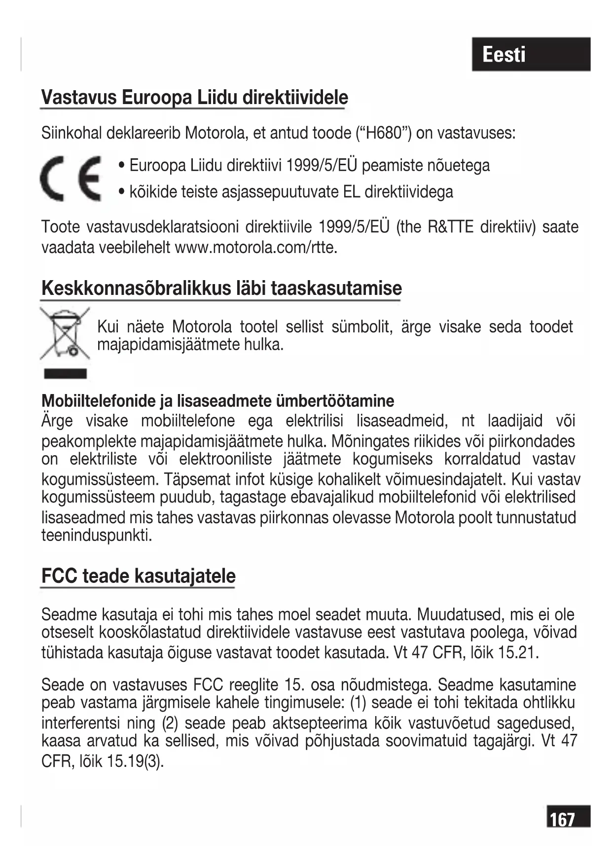 - kõikide teiste asjassepuutuvate EL direktiividega Toote vastavusdeklaratsiooni direktiivile 1999/5/EÜ (the R&TTE direktiiv) saate vaadata veebilehelt www.motorola.com/rtte. Keskkonnasõbralikkus läbi taaskasutamise Kui näete Motorola tootel sellist sümbolit, ärge visake seda toodet majapidamisjäätmete hulka. Mobiiltelefonide ja lisaseadmete ümbertöötamine Ärge visake mobiiltelefone ega elektrilisi lisaseadmeid, nt laadijaid või peakomplekte majapidamisjäätmete hulka. Mõningates riikides või piirkondades on elektriliste või elektrooniliste jäätmete kogumiseks korraldatud vastav kogumissüsteem. Täpsemat infot küsige kohalikelt võimuesindajatelt. Kui vastav kogumissüsteem puudub, tagastage ebavajalikud mobiiltelefonid või elektrilised lisaseadmed mis tahes vastavas piirkonnas olevasse Motorola poolt tunnustatud teeninduspunkti. FCC teade kasutajatele Seadme kasutaja ei tohi mis tahes moel seadet muuta. Muudatused, mis ei ole otseselt kooskõlastatud direktiividele vastavuse eest vastutava poolega, võivad tühistada kasutaja õiguse vastavat toodet kasutada. Vt 47 CFR, lõik 15.21. Seade on vastavuses FCC reeglite 15. osa nõudmistega. Seadme kasutamine peab vastama järgmisele kahele tingimusele: (1) seade ei tohi tekitada ohtlikku interferentsi ning (2) seade peab aktsepteerima kõik vastuvõetud sagedused, kaasa arvatud ka sellised, mis võivad põhjustada soovimatuid tagajärgi. Vt 47 CFR, lõik 15.19(3). Eesti168 Eesti Peakomplekt ja selle osade ülevaade Vt joonis 1 lk 1. Enne oma uue Bluetooth-vabakäe-peakomplektiga H680 kasutamist tutvuge sellega veidi. Peakomplektiga on kaasas laadimisalus, mida saab kasutada nii laadimiseks kui ka lihtsalt peakomplekti hoidmiseks. Bluetooth-peakomplekt