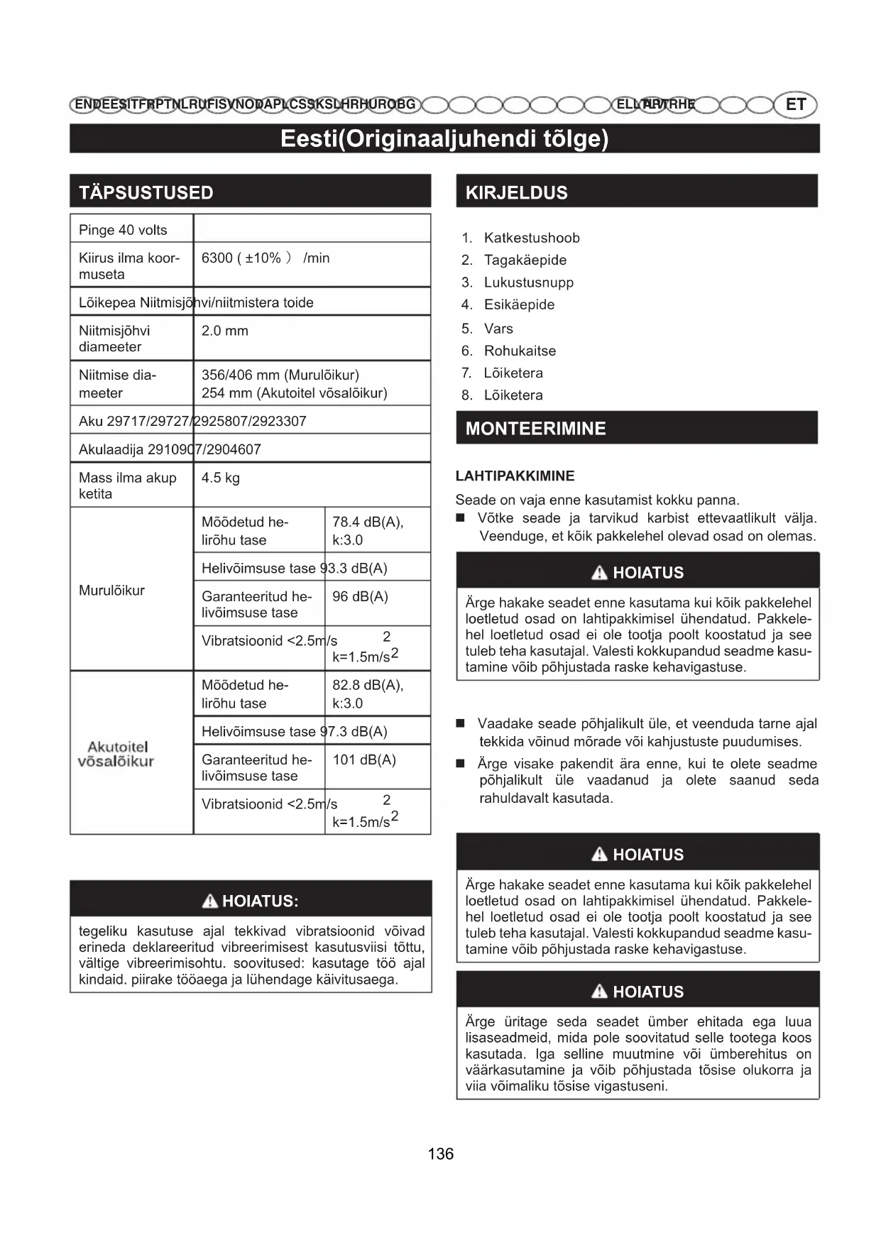 EN DE ES IT FR PT NL RU FI SV NO DA PL CS SK SL HR HU RO BGAR TR HEEL LT LV HOIATUS Et vältida juhuslikku käivitumist, mis võib põhjustada tõ- siseid kehavigastusi, ühendage osade kokkupanemisel mootori süüteküünla juhe alati süüteküünla küljest lahti. ROHUKAITSE PAIGALDAMINE Vaata Joonis 2. HOIATUS Vältige kokkupuudet teraga. Nõude täitmata jätmine võib põhjustada vigastusi. Pöörake murutrimmer ümber, et trimmeripeale ligi pääseda. Kasutage Phillipsi kruvikeerajat ja eemaldage varempaigaldatud kruvid (a) trimmeripealt. Pange juhik (b) trimmeripeale ja lükake juhik alusele mööda alusel olevaid sooni. Ühitage juhiku kruviavad trimmeripeal olevate kruviavadega. Pange kruvid trimmeripea sisse ja kinnitage juhik oma kohale. Pange kaitsekate (c) juhikule ja lükake kaitsekate juhiku peale. Ühitage kaitsekattel olevad kruviavad juhiku kruviavadega. Pange kruvid juhiku sisse ja kinnitage kaitsekate oma kohale. HOIATUS Olge alati, ka siis kui tunnete masinat, ettevaatlik. Piisab ühest hetkest, mil tähelepanu hajub ja võib kaasa tuua raskeid vigastusi. HOIATUS Kaitske alati silmi. Nõude täitmata jätmine võib põhjusta- da raskeid vigastusi, kui mõni osa paiskub silma. HOIATUS Ärge kasutage komponente või tarvikuid, mida tootja ei ole soovitanud. Mittesoovitatud osade kasutamine võib põhjustada raskeid kehavigastusi. ESIKÄEPIDEME PAIGALDAMINE Vaata Joonis 3. Keerake maha nupp 'A', eemaldage klamber 'B' ja alumine tugi 'C', olge hoolikad, et toes olev vedru ei läheks kaotsi. Asetage käepide alumise toe sisse. Paigaldage klamber 'B' alumisele toele 'C' ja asetage kogu komplekt varrele. Pöörake käepide kõige mugavamasse tööasendisse, ja sulgege nupuga 'A'. KASUTAMINE Hoidke trimmeril parema käega tagumisest käepidemest ja vasakuga esikäepidemest. Hoidke töö ajal seadet kindlalt kahe käega. Hoidke trimmerit mugavas positsioonis nii, et tagumine käepide oleks puusade kõrgusel. Rakendage mootori täispöördeid Kui prügi keerdub ümber pikendusvarda, siis LASKE LÜLITI LAHTI ja eemaldage see. Kasutage töö ajal rakmeid. AKU PAIGALDAMINE Vaata Joonis 4. Asetage aku trimmerisse. Joondage aku vabastustiib trimmeri akuruumi sisemiste avadega. Enne masina kasutama hakkamist kontrollige, et sulgurkeel, mis asub aku all, oleks korralikult kinni ja aku ise ei liiguks. AKU EEMALDAMINE Vaata Joonis 4. Trimmeri seiskamiseks vabastage lülituspäästik ja vabastage see lukustist. Trimmeri välja lülitamiseks vajutage toitenuppu. Hoidke all akupaketi allosas olevat riivistusnuppu. Võtke akupakett hekitrimmerist välja. TRIMMERI KÄIVITAMINE/SEISKAMINE Vaata Joonis 5. Käivitamine Hoidke all lukustusnuppu ja vajutage lüliti päästikule. Seiskamine Vabastage lüliti päästik. Et peatada trimmer, vaid vabastab muutuva kiirusega kontrolli vallandada. HOIATUS Müratase. Masina kasutamisel on müra vältimine või- matu. Mürarikka töö kestvus on piiratud teatava ajaga. Lisaks pikematele puhkepausidele tuleb lühendada ka tööaega. Enda isiklikuks kaitseks ja lähedal viibivate isikute kaitseks tuleb kanda sobivaid kuulmiskaitseva- hendeid; 137Eesti(Originaaljuhendi tõlge)