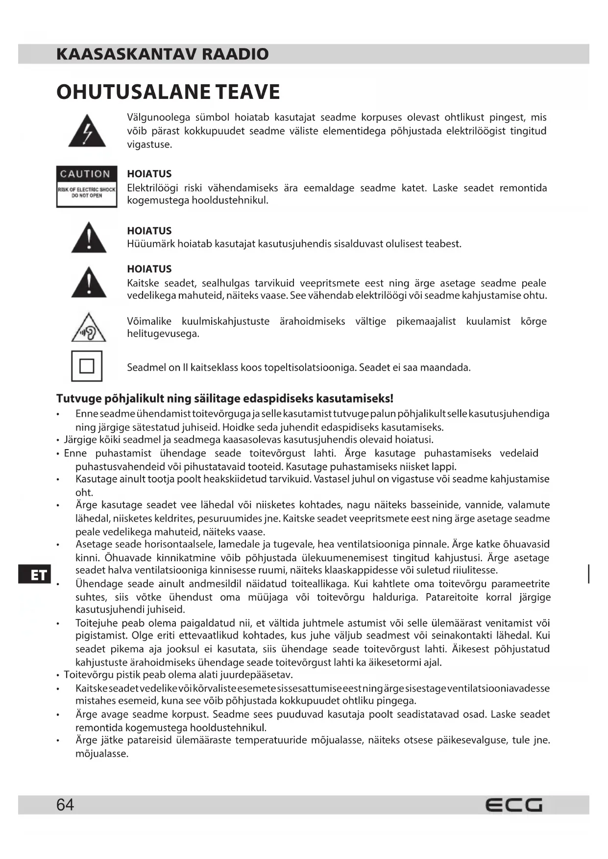 OHUTUSALANE TEAVE Välgunoolega sümbol hoiatab kasutajat seadme korpuses olevast ohtlikust pingest, mis võib pärast kokkupuudet seadme väliste elementidega põhjustada elektrilöögist tingitud vigastuse. HOIATUS Elektrilöögi riski vähendamiseks ära eemaldage seadme katet. Laske seadet remontida kogemustega hooldustehnikul. HOIATUS Hüüumärk hoiatab kasutajat kasutusjuhendis sisalduvast olulisest teabest. HOIATUS Kaitske seadet, sealhulgas tarvikuid veepritsmete eest ning ärge asetage seadme peale vedelikega mahuteid, näiteks vaase. See vähendab elektrilöögi või seadme kahjustamise ohtu. Võimalike kuulmiskahjustuste ärahoidmiseks vältige pikemaajalist kuulamist kõrge helitugevusega. Seadmel on II kaitseklass koos topeltisolatsiooniga. Seadet ei saa maandada. Tutvuge põhjalikult ning säilitage edaspidiseks kasutamiseks!