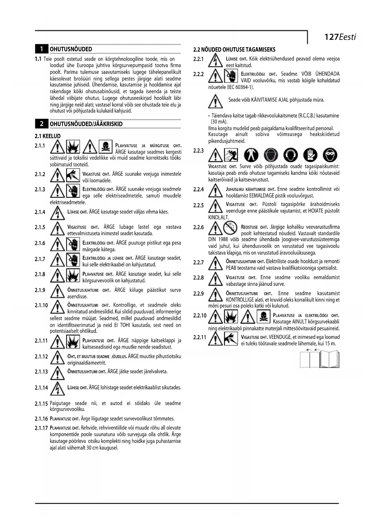 vigastuse oht. VEENDUGE, et inimesed ega loomad ei tuleks töötavale seadmele lähemale, kui 15 m.128 Eesti