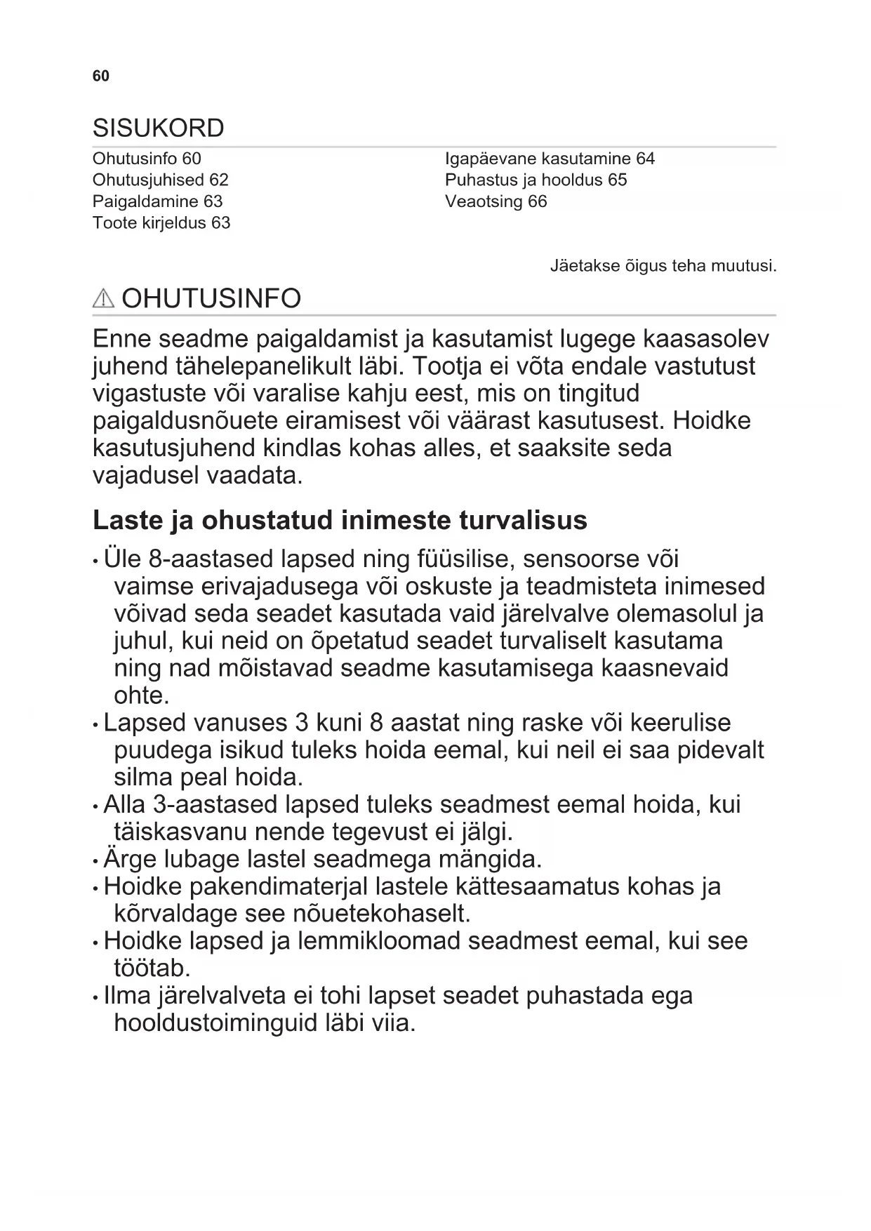 - Ilma järelvalveta ei tohi lapset seadet puhastada ega hooldustoiminguid läbi viia. 60Üldine ohutus