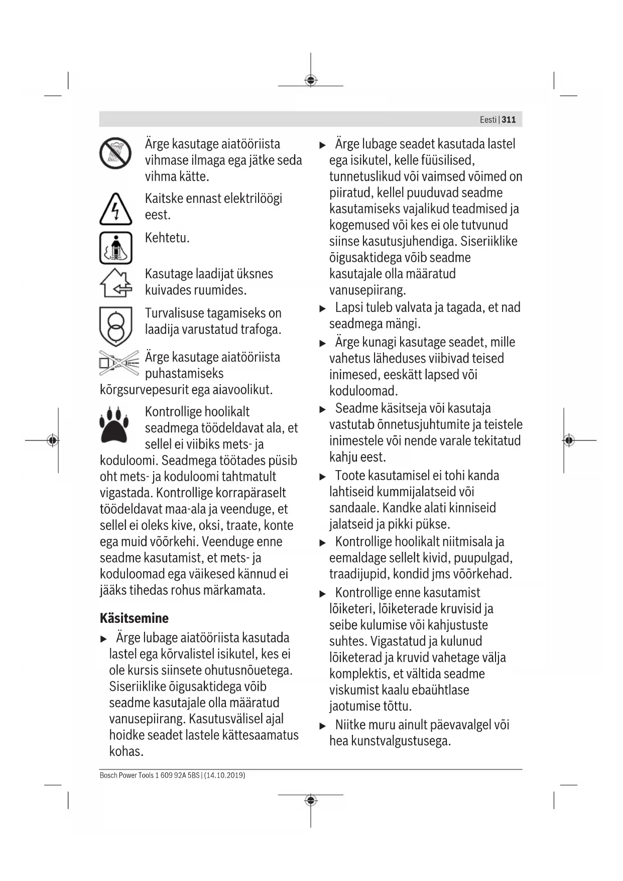 Tarnekomplekt ei sisalda kõiki kasutusjuhendis olevatel joonistel kujutatud või kasutusjuhendis nimetatud lisatarvikuid. Lisatarvikute täieliku loetelu leiate meie lisatarvikute kataloogist. Kasutuselevõtt Tööohutus u Tähelepanu! Lülitage enne puhastus- ja hooldustööde tegemist aiatööriist välja, aktiveerige elektritoite katkestuslüliti ja eemaldage aku. Lülitage aiatööriist välja ka juhul, kui toitejuhe on vigastatud või keerdu läinud. u Lõiketerad pöörlevad veel mõni sekund pärast aiatööriista väljalülitamist. u Ettevaatust: Pöörlevaid lõiketeri ei tohi katsuda. Aku laadimine Akul on temperatuurikontroll, mis võimaldab laadida akut ainult temperatuurivahemikus 0°C ja 35°C. See tagab aku pika kasutusea. Bosch Power Tools 1 609 92A 5BS | (14.10.2019)318 | Eesti Märkus: Aku tarnitakse osaliselt laetuna. Aku võimsuse tagamiseks laadige aku enne esmakasutust laadijas täiesti täis. Liitiumioonakut saab laadida igal ajal, ilma et aku kasutusiga lüheneks. Laadimise katkestamine akut ei kahjusta. Liitiumioonakut kaitseb täieliku tühjenemise eest akuelementide elektrooniline kaitse „Electronic Cell Protection (ECP)“. Tühja akuga lülitab kaitselüliti elektritööriista välja: Aiatööriist ei tööta enam. Pärast seda, kui seade on automaatselt välja lülitunud, ei tohi sisse-välja-lülitit uuesti lülitada. Aku võib kahjustada saada. Järgige akude kõrvaldamisjuhiseid. Aku paigaldamine/eemaldamine Märkus: Ebasobiva aku kasutamine võib põhjustada seadme tõrkeid või kahjustusi. Sisestage täislaetud aku. Veenduge, et aku on paigaldatud õigesti. Kui soovite akut seadmest eemaldada, vajutage aku lukust avamise nuppu ja tõmmake aku välja. Laadimine Laadimine algab kohe, kui laadija võrgupistik on ühendatud pistikupesasse ja aku on laadijasse paigutatud. Tänu intelligentsele laadimisprotsessile tuvastab seade aku laadimisoleku automaatselt ja sõltuvalt akutemperatuurist ja -pingest valitakse sobivaim laadimisvool. See säästab akut ja tagab, et aku on laadijas alati täielikult laetud. Akulaadija (AL 3620 CV/AL 3640 CV/AL 36V-20) indikaatortulede tähendus Kiirlaadimine Kiirlaadimisest annab märku aku laadimisnäit, mis vilgub roheliselt. Aku indikaatortuli: Laadimise ajal süttivad kolm rohelist leedi üksteise järel ja kustuvad siis hetkeks. Aku on täiesti laetud, kui rohelised leedid jäävad püsivalt põlema. Umbes 5minutit pärast aku täitumist kustuvad rohelised leedid uuesti. Märkus: Kiirlaadimine on võimalik üksnes siis, kui aku temperatuur on laadimiseks ettenähtud vahemikus, vt peatükki „Tehnilised andmed“. Aku on laetud Rohelise leed-näidiku püsituli annab märku, et aku on täis. Peale selle kõlab 2 sekundi pikkune helisignaal, mis annab kuuldavalt märku, et aku on täis. Seejärel võib aku laadijast välja võtta ja seda kasutama hakata. Kui akusahtel on laadijas tühi, näitab leed-näidiku püsituli, et võrgupistik on ühendatud pistikupessa ja laadija on töövalmis. Aku temperatuur on alla 0 °C või üle 45 °C Leed-näidiku punane püsituli näitab, et aku temperatuur ei jää lubatud temperatuurivahemikku, vt peatükki „Tehnilised andmed“. Kohe kui aku on lubatud temperatuuri saavutanud, lülitub laadija automaatselt ümber kiirlaadimisele. Kui aku temperatuur on väljaspool ettenähtud laadimisvahemikku, süttib aku laadijasse asetamisel punane leed. Laadimine ei ole võimalik Kui laadimisel esineb mõni muu tõrge, siis annab sellest märku punase leed-näidu vilkumine. Laadimist ei saa alustada ja aku laadimine ei ole võimalik (vt lõiku „Veaotsing“). Laadimisjuhised Pideva või mitme üksteisele järgneva laadimistsükli puhul võib laadija kuumeneda. See on tavapärane ega viita laadija tehnilisele defektile. Kui pärast laadimist on aku kasutusaeg tunduvalt lühem, on aku kasutusaeg lõppenud ja aku tuleb välja vahetada. Järgige kõrvaldamisjuhiseid. Akujahutus (active air cooling) Laadijasse integreeritud ventilaatori juhtplokk kontrollib paigaldatud aku temperatuuri. Kui aku temperatuur tõuseb üle 30 °C, jahutab ventilaator aku vajalikule laadimistemperatuurile. Sisselülitatud ventilaator tekitab iseloomulikku ventileerimismüra. Kui ventilaator ei tööta, on aku temperatuur laadimiseks sobiv või on ventilaator rikkis. Sellisel juhul aku laadimisaeg pikeneb. Tööjuhised Aku laadimisoleku näit Aku on varustatud laadimisoleku näiduga, mis näitab aku täitetaset. Aku laadimisoleku näit koosneb 3 rohelisest leedist. Aku laadimisoleku näidu käivitamiseks vajutage aku laadimisoleku näidu nuppu. Aku laadimisoleku näit kustub 5 sekundi möödumisel iseenesest. Täitetaset saab kontrollida ka eemaldatud akul. Leed-näit Aku mahtuvus 3 rohelise leedi püsituli ≥ 2/3 2 rohelise leedi püsituli ≥ 1/3 1 rohelise leedi püsituli ≤ 1/3 1 roheline vilkuv leed Varu Kui ükski leed pärast sisselülitamist ei sütti, on aku vigane ja tuleb välja vahetada. Turvalisuse tagamiseks saab aku täitetaset kontrollida üksnes siis, kui aiatööriist ei tööta. 1 609 92A 5BS | (14.10.2019) Bosch Power ToolsEesti | 319 Laadimise ajal süttivad kolm rohelist leedi üksteise järel ja kustuvad siis hetkeks. Aku on täiesti laetud, kui kolm rohelist leedi püsivalt põlevad. Umbes 5minutit pärast aku täitumist rohelised leedid kustuvad uuesti. Aku temperatuurikontrolli näidik Temperatuurikontrolli näidiku punane leed näitab, et aiatööriista aku või elektroonika (sisestatud akuga) ei ole ettenähtud temperatuurivahemikus. Sellisel juhul aiatööriist ei tööta või töötab vähendatud võimsusega. Aku temperatuurikontroll Punane leed vilgub, kui lülitada nuppu või sisse-välja-lülitit (sisestatud akuga): Aku temperatuur ei jää töötemperatuuri lubatud vahemikku. Kui temperatuur on üle 70 °C, lülitub aku nii kauaks välja, kuni jõuab taas lubatud temperatuurivahemikku. Aiatööriista elektroonika temperatuurikontroll Kui lülitada nuppu või sisse-välja-lülitit, p