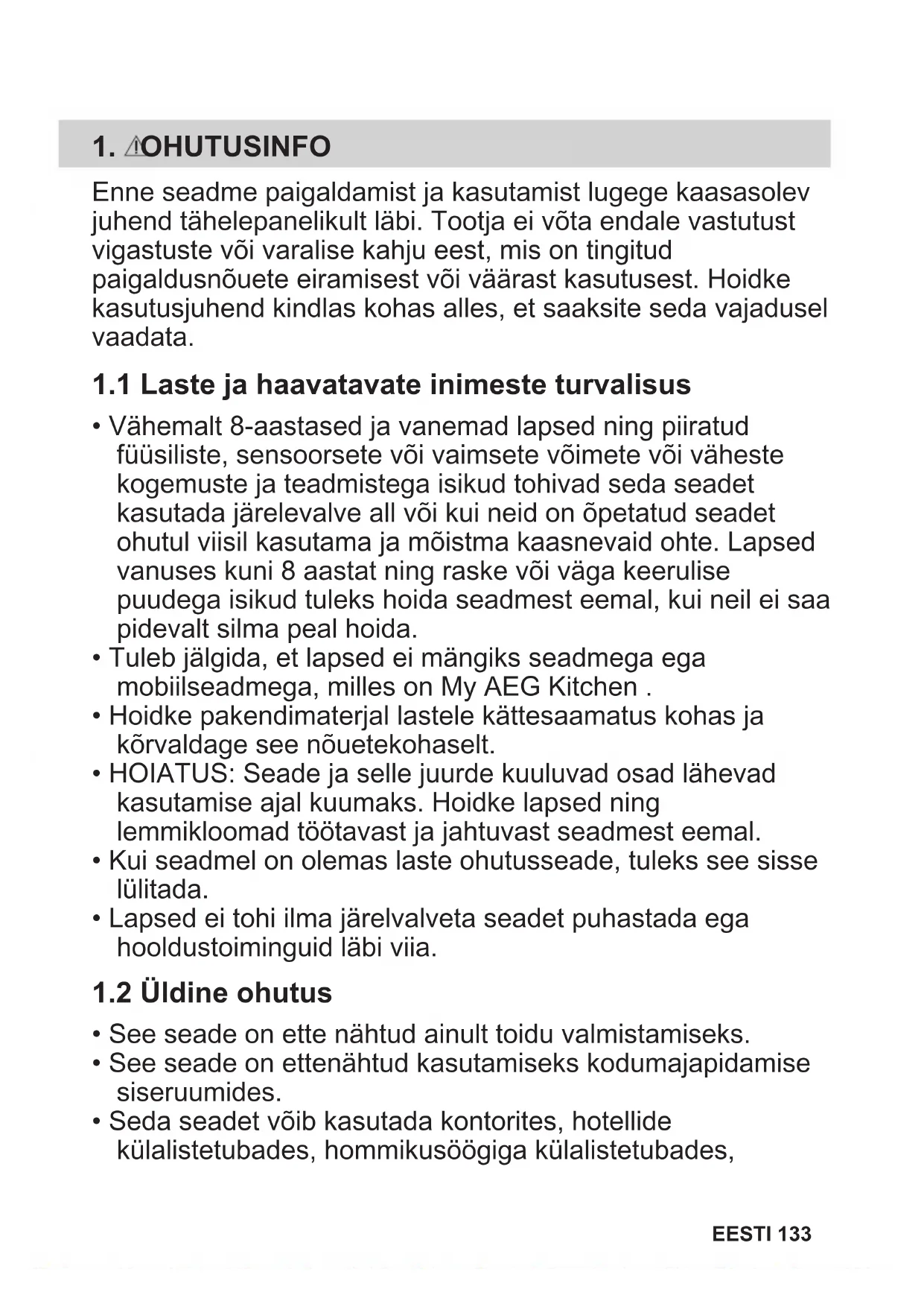 EESTI 131My AEG Kitchen app 132 EESTI1. OHUTUSINFO Enne seadme paigaldamist ja kasutamist lugege kaasasolev juhend tähelepanelikult läbi. Tootja ei võta endale vastutust vigastuste või varalise kahju eest, mis on tingitud paigaldusnõuete eiramisest või väärast kasutusest. Hoidke kasutusjuhend kindlas kohas alles, et saaksite seda vajadusel vaadata.