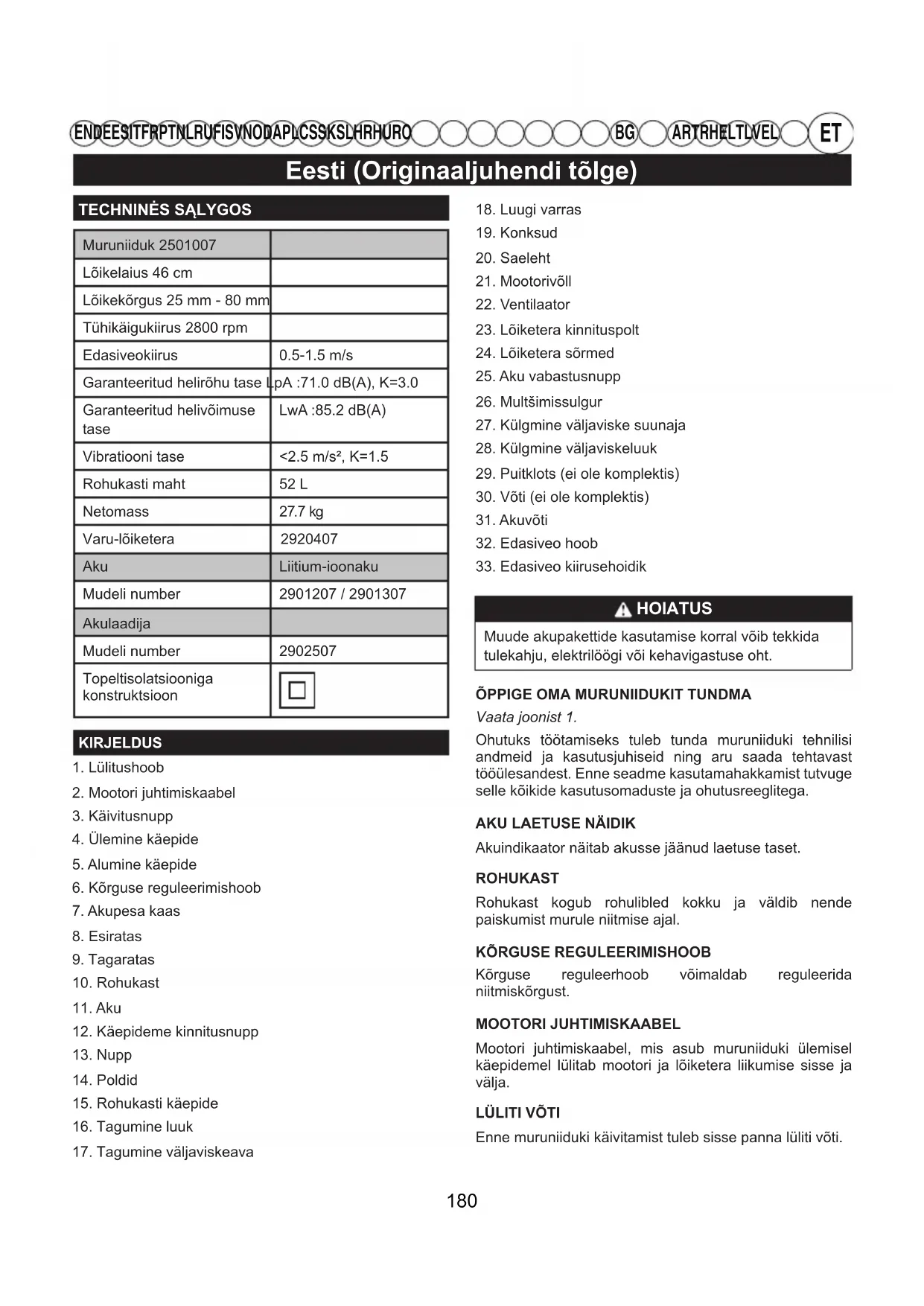 TECHNINĖS SĄLYGOSMuruniiduk 2501007Lõikelaius 46 cmLõikekõrgus 25 mm - 80 mmTühikäigukiirus 2800 rpmEdasiveokiirus 0.5-1.5 m/sGaranteeritud helirõhu tase LpA :71.0 dB(A), K=3.0Garanteeritud helivõimuse tase LwA :85.2 dB(A)Vibratiooni tase <2.5 m/s², K=1.5Rohukasti maht 52 L Netomass 27.7 kg Varu-lõiketera 2920407Aku Liitium-ioonakuMudeli number 2901207 / 2901307AkulaadijaMudeli number 2902507TopeltisolatsioonigakonstruktsioonKIRJELDUS1. Lülitushoob2. Mootori juhtimiskaabel3. Käivitusnupp4. Ülemine käepide5. Alumine käepide6. Kõrguse reguleerimishoob7. Akupesa kaas8. Esiratas9. Tagaratas10. Rohukast11. Aku12. Käepideme kinnitusnupp13. Nupp14. Poldid 15. Rohukasti käepide16. Tagumine luuk17. Tagumine väljaviskeava18. Luugi varras19. Konksud20. Saeleht21. Mootorivõll22. Ventilaator23. Lõiketera kinnituspolt24. Lõiketera sõrmed25. Aku vabastusnupp26. Multšimissulgur27. Külgmine väljaviske suunaja28. Külgmine väljaviskeluuk29. Puitklots (ei ole komplektis)30. Võti (ei ole komplektis)31. Akuvõti32. Edasiveo hoob33. Edasiveo kiirusehoidik HOIATUS Muude akupakettide kasutamise korral võib tekkidatulekahju, elektrilöögi või kehavigastuse oht.ÕPPIGE OMA MURUNIIDUKIT TUNDMAVaata joonist 1.Ohutuks töötamiseks tuleb tunda muruniiduki tehnilisi andmeid ja kasutusjuhiseid ning aru saada tehtavast tööülesandest. Enne seadme kasutamahakkamist tutvuge selle kõikide kasutusomaduste ja ohutusreeglitega.AKU LAETUSE NÄIDIKAkuindikaator näitab akusse jäänud laetuse taset.ROHUKASTRohukast kogub rohulibled kokku ja väldib nende paiskumist murule niitmise ajal.KÕRGUSE REGULEERIMISHOOBKõrguse reguleerhoob võimaldab reguleerida niitmiskõrgust.MOOTORI JUHTIMISKAABELMootori juhtimiskaabel, mis asub muruniiduki ülemisel käepidemel lülitab mootori ja lõiketera liikumise sisse ja välja.LÜLITI VÕTIEnne muruniiduki käivitamist tuleb sisse panna lüliti võti. 180Eesti (Originaaljuhendi tõlge)