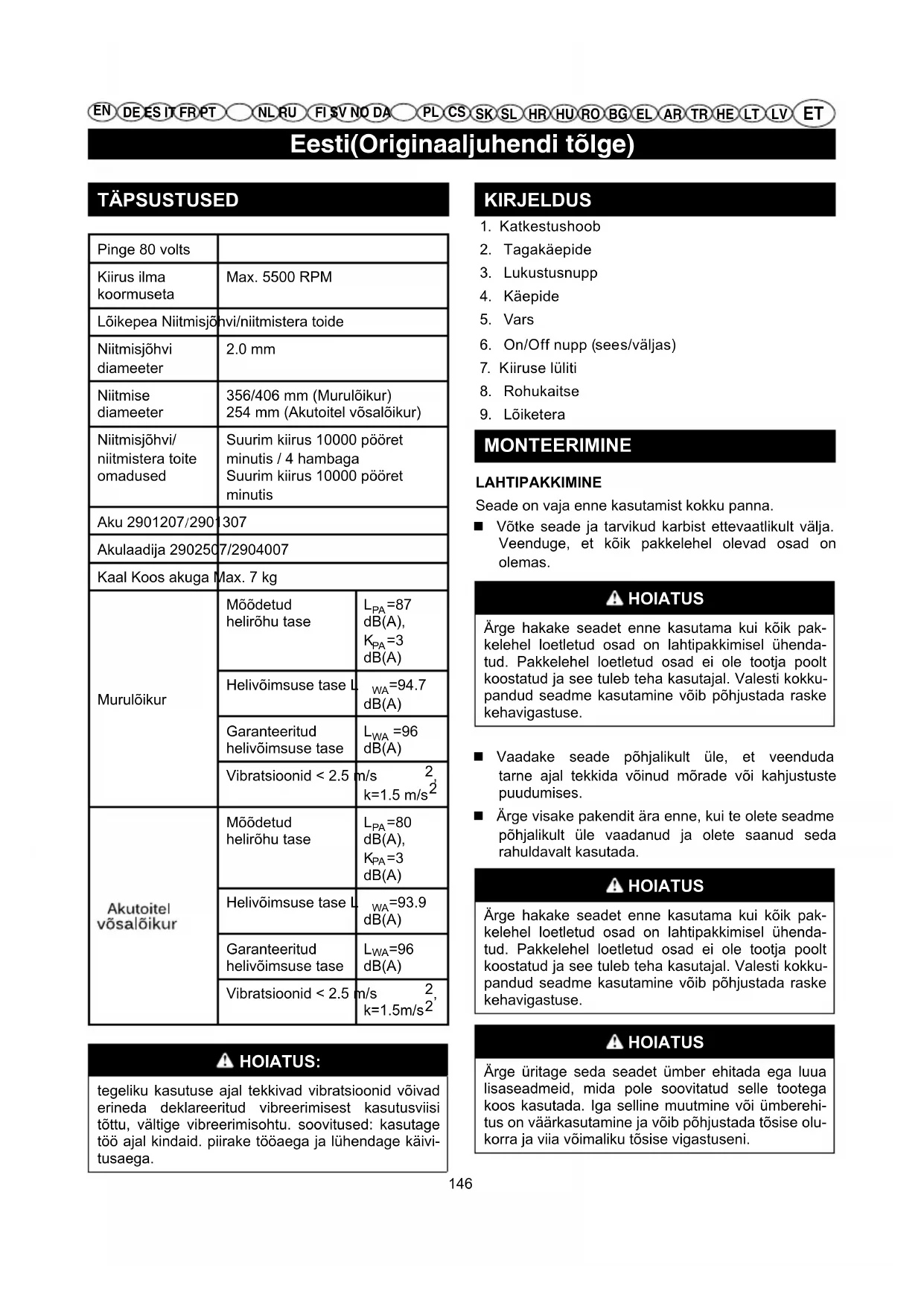 HOIATUS: tegeliku kasutuse ajal tekkivad vibratsioonid võivad erineda deklareeritud vibreerimisest kasutusviisi tõttu, vältige vibreerimisohtu. soovitused: kasutage töö ajal kindaid. piirake tööaega ja lühendage käivi- tusaega. KIRJELDUS