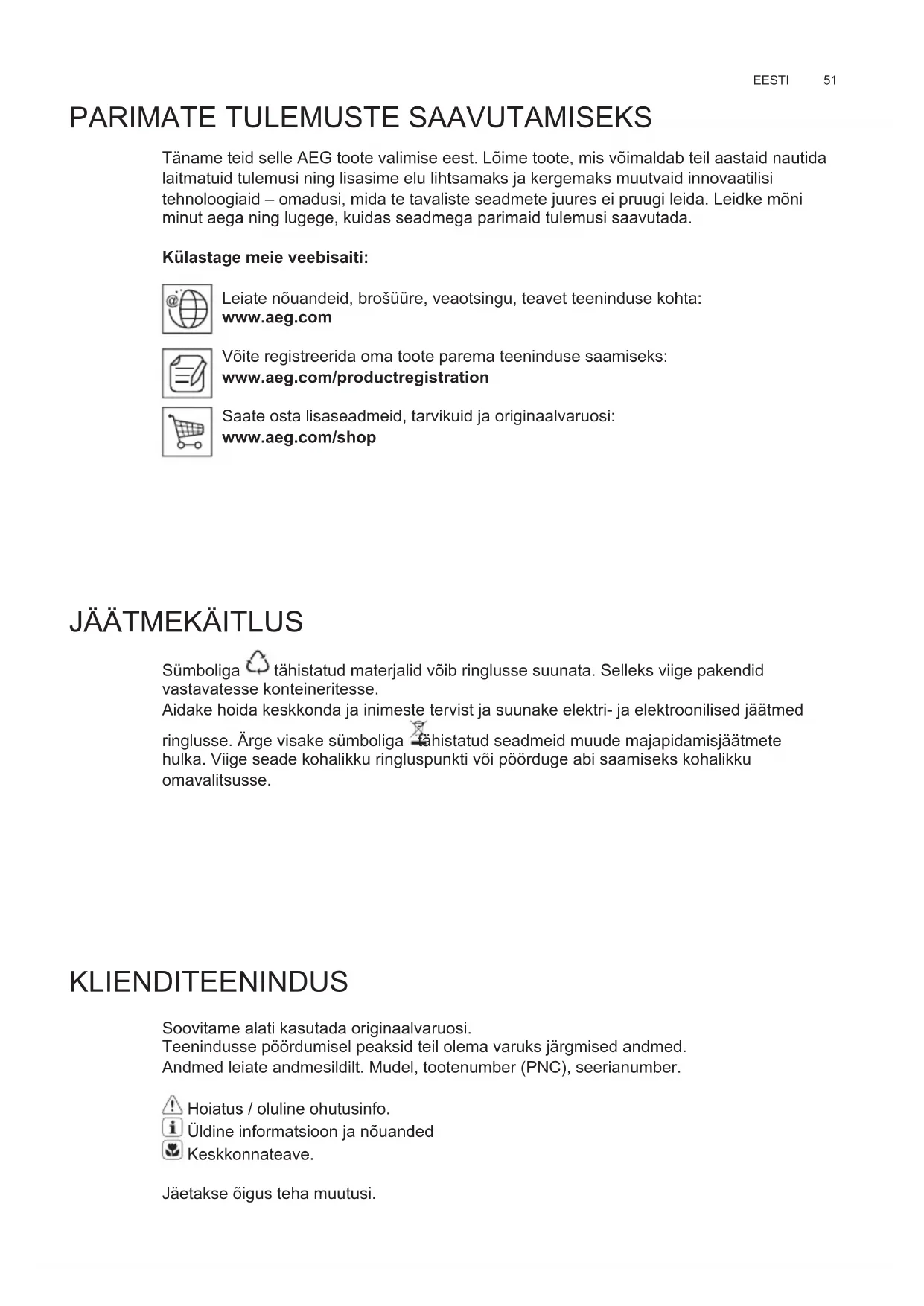 ϢІϾϿВЋϼІϹ ЃЄϼϵЂЄ ЂІ БϿϹϾІЄЂЅϹІϼ. ! ϣЄϹϺϸϹ ЋϹЀ ЃЄϼϾϴЅϴІАЅГ Ͼ ϿϴЀЃϴЀ ЇϵϹϸϼІϹЅА ϶ ІЂЀ, ЋІЂ ЂЁϼ ЂЅІЏϿϼ. ϜЅЃЂϿАϻЇϽІϹ ϸϿГ БІЂϷЂ ϿϼЌА ϷϴϿЂϷϹЁЁЏϹ ϸϴЀЃЏ Ёϴ 12V - 20W ЀϴϾЅ - G4, ЁϹ ЃЄϼϾϴЅϴГЅА Ͼ ЁϼЀ ЄЇϾϴЀϼ.51 EESTI Täname teid selle AEG toote valimise eest. Lõime toote, mis võimaldab teil aastaid nautida laitmatuid tulemusi ning lisasime elu lihtsamaks ja kergemaks muutvaid innovaatilisi tehnoloogiaid – omadusi, mida te tavaliste seadmete juures ei pruugi leida. Leidke mõni minut aega ning lugege, kuidas seadmega parimaid tulemusi saavutada. Külastage meie veebisaiti: Leiate nõuandeid, brošüüre, veaotsingu, teavet teeninduse kohta: www.aeg.com Võite registreerida oma toote parema teeninduse saamiseks: www.aeg.com/productregistration Saate osta lisaseadmeid, tarvikuid ja originaalvaruosi: www.aeg.com/shop