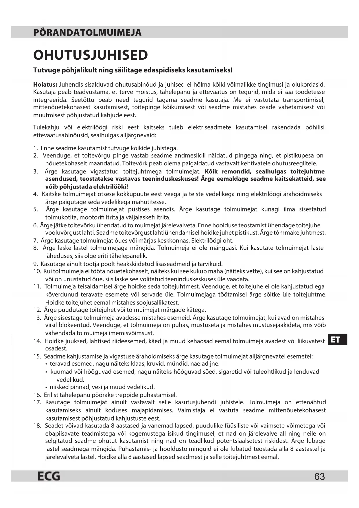 17. Kasutage tolmuimejat ainult vastavalt selle kasutusjuhendi juhistele. Tolmuimeja on ettenähtud