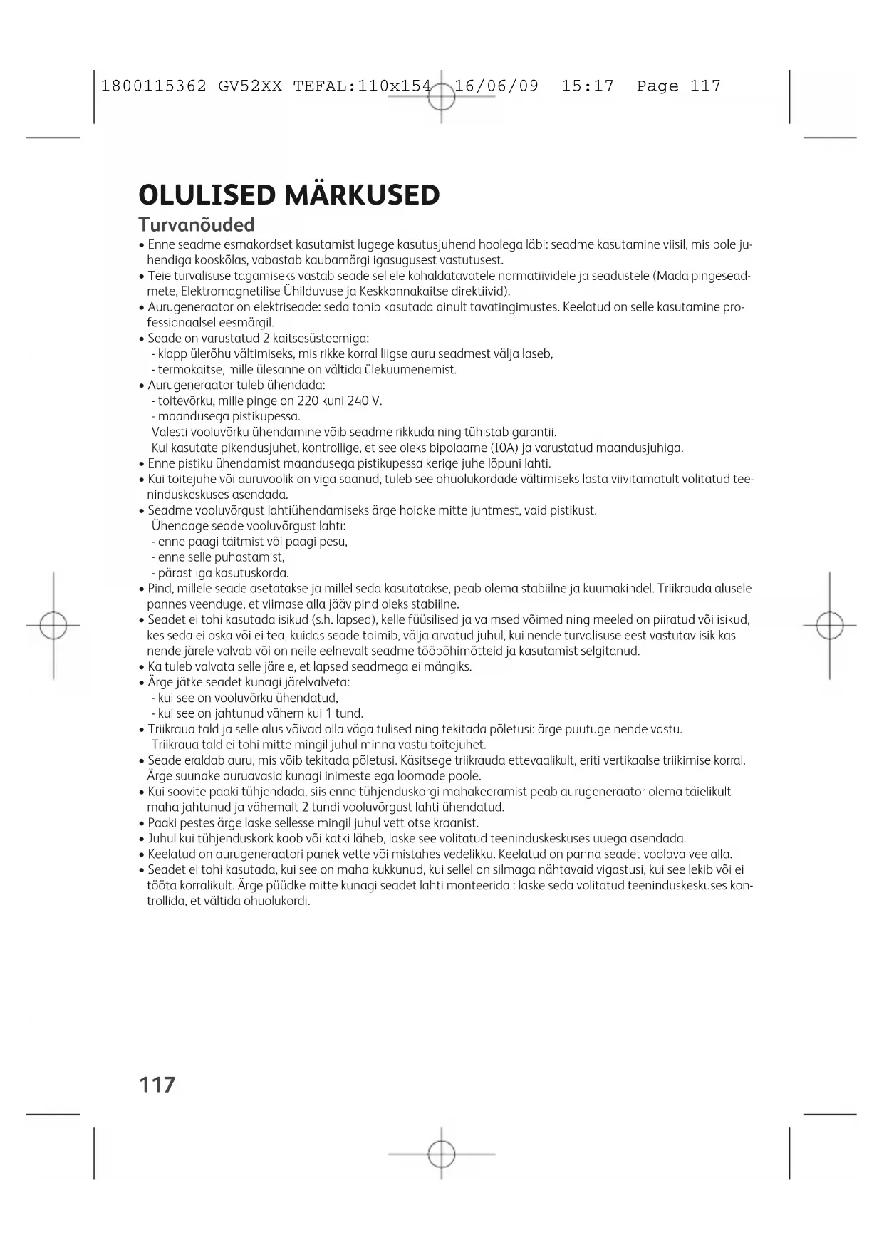 - Seadet ei tohi kasutada, kui see on maha kukkunud, kui sellel on silmaga nähtavaid vigastusi, kui see lekib või ei tööta korralikult. Ärge püüdke mitte kunagi seadet lahti monteerida : laske seda volitatud teeninduskeskuses kon- trollida, et vältida ohuolukordi. 1800115362 GV52XX TEFAL:110x154 16/06/09 15:17 Page 117118
