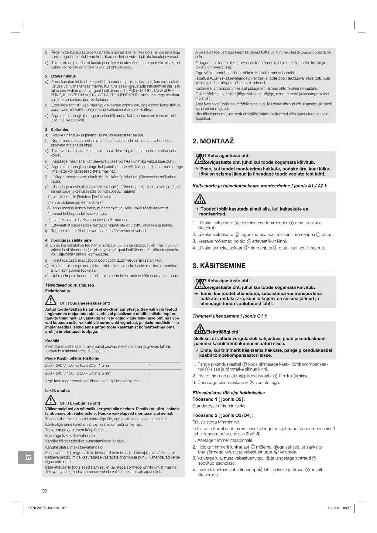 OHT! Kehavigastuste oht! Lõikevigastuste oht, juhul kui toode kogemata käivitub. v Enne, kui toodet monteerima hakkate, oodake ära, kuni lõike- jõhv on seisma jäänud ja ühendage toode voolutoitest lahti. Kaitsekatte ja taimekaitsekaare monteerimine [ joonis A1 / A2 ]: OHT! v Toodet tohib kasutada ainult siis, kui kaitsekate on monteeritud.