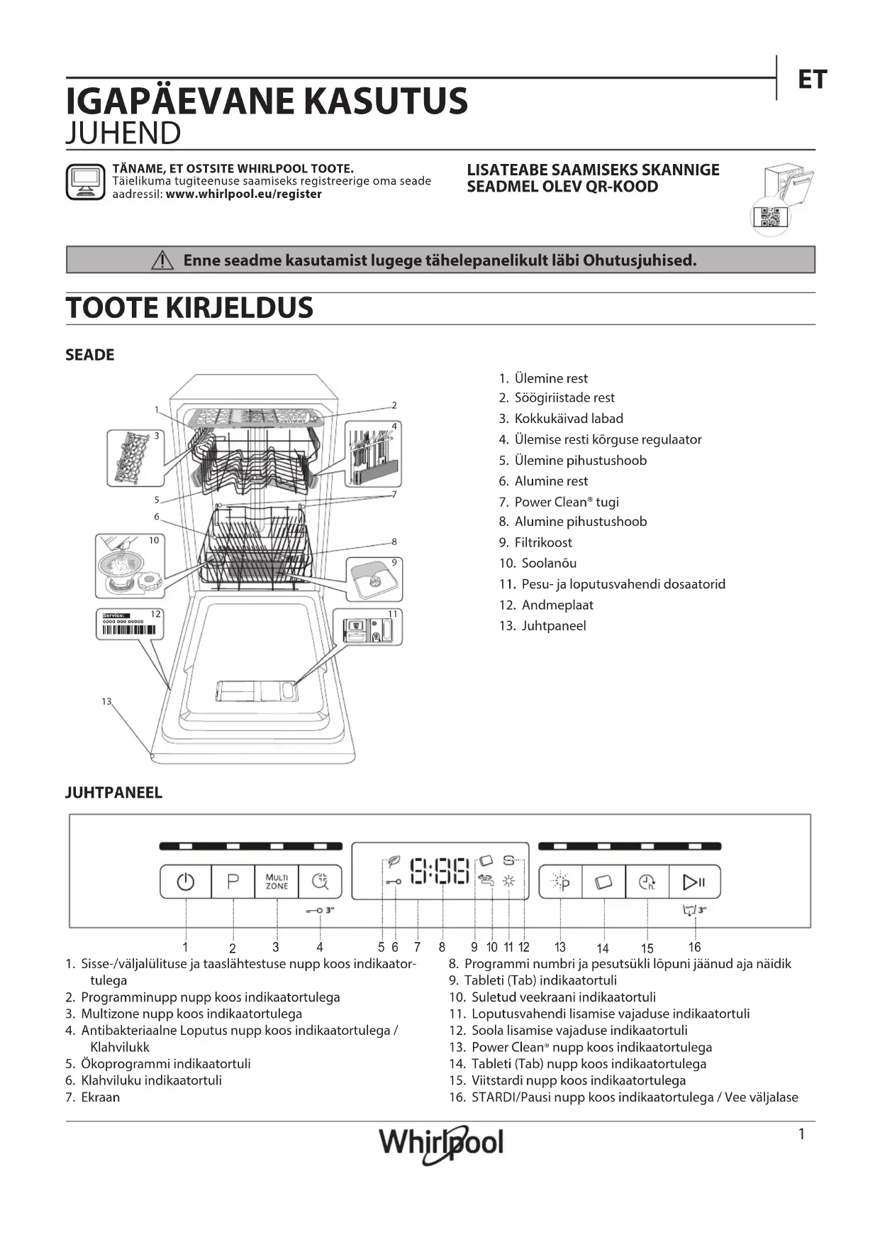 JUHEND SEADE TOOTE KIRJELDUS JUHTPANEEL 1. Ülemine rest2. Söögiriistade rest3. Kokkukäivad labad4. Ülemise resti kõrguse regulaator5. Ülemine pihustushoob6. Alumine rest7. Power Clean® tugi8. Alumine pihustushoob9. Filtrikoost10. Soolanõu11. Pesu- ja loputusvahendi dosaatorid12. Andmeplaat13. Juhtpaneel1. Sisse-/väljalülituse ja taaslähtestuse nupp koos indikaator-tulega2. Programminupp nupp koos indikaatortulega3. Multizone nupp koos indikaatortulega4. Antibakteriaalne Loputus nupp koos indikaatortulega / Klahvilukk5. Ökoprogrammi indikaatortuli6. Klahviluku indikaatortuli7. Ekraan8. Programmi numbri ja pesutsükli lõpuni jäänud aja näidik9. Tableti (Tab) indikaatortuli10. Suletud veekraani indikaatortuli11. Loputusvahendi lisamise vajaduse indikaatortuli12. Soola lisamise vajaduse indikaatortuli13. Power Clean® nupp koos indikaatortulega14. Tableti (Tab) nupp koos indikaatortulega15. Viitstardi nupp koos indikaatortulega16. STARDI/Pausi nupp koos indikaatortulega / Vee väljalaseTÄNAME, ET OSTSITE WHIRLPOOL TOOTE. Täielikuma tugiteenuse saamiseks registreerige oma seade aadressil: www.whirlpool.eu/register
