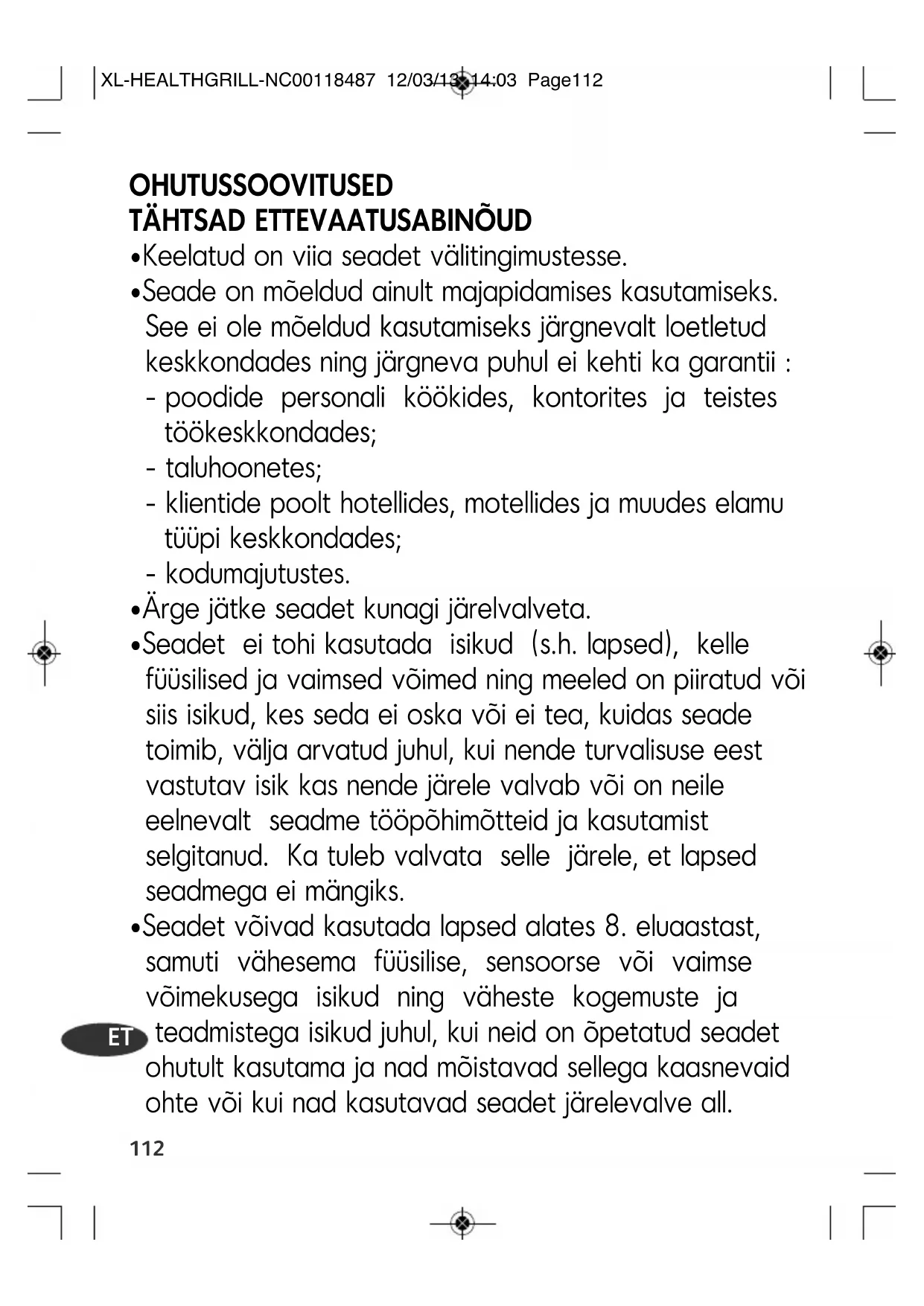 XL-HEALTHGRILL-NC00118487 12/03/13 14:03 Page112Lapsed ei tohi seadmega mängida. Seadet ei tohi puhastada ega hooldada lapsed, v.a juhul, kui nad on vanemad kui 8 aastat ja järelevalve all. Hoidke seadet ja selle kaablit alla 8-aastastele lastele kättesaamatult.