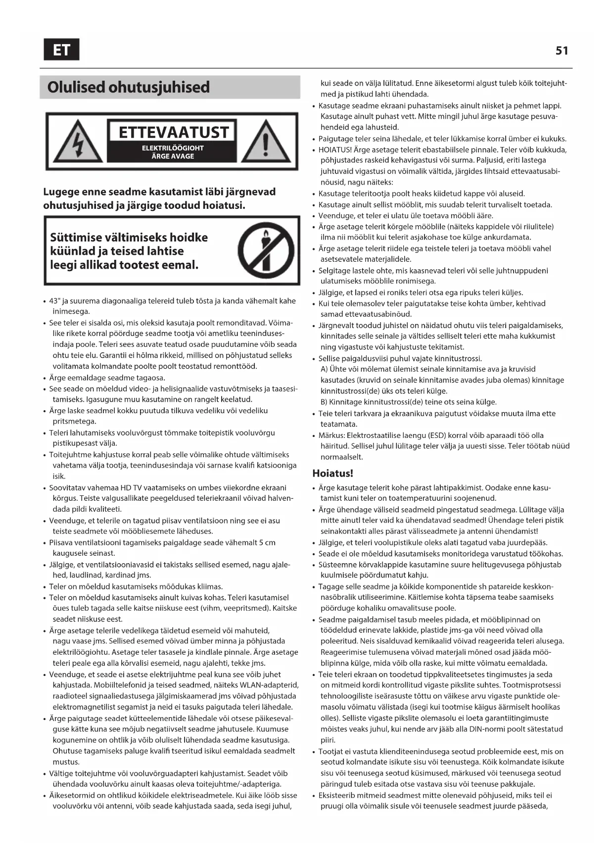 Lugege enne seadme kasutamist läbi järgnevad ohutusjuhised ja järgige toodud hoiatusi. Süttimise vältimiseks hoidke küünlad ja teised lahtise leegi allikad tootest eemal.