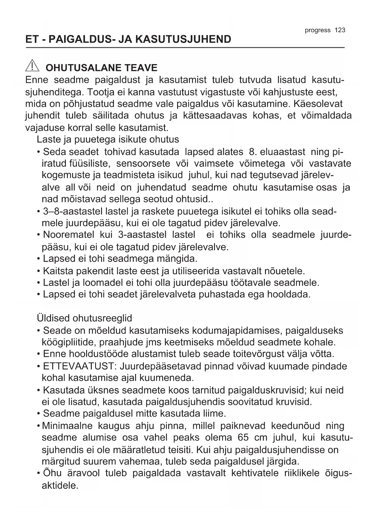 OHUTUSALANE TEAVE Enne seadme paigaldust ja kasutamist tuleb tutvuda lisatud kasutu- sjuhenditega. Tootja ei kanna vastutust vigastuste või kahjustuste eest, mida on põhjustatud seadme vale paigaldus või kasutamine. Käesolevat juhendit tuleb säilitada ohutus ja kättesaadavas kohas, et võimaldada vajaduse korral selle kasutamist. Laste ja puuetega isikute ohutus
