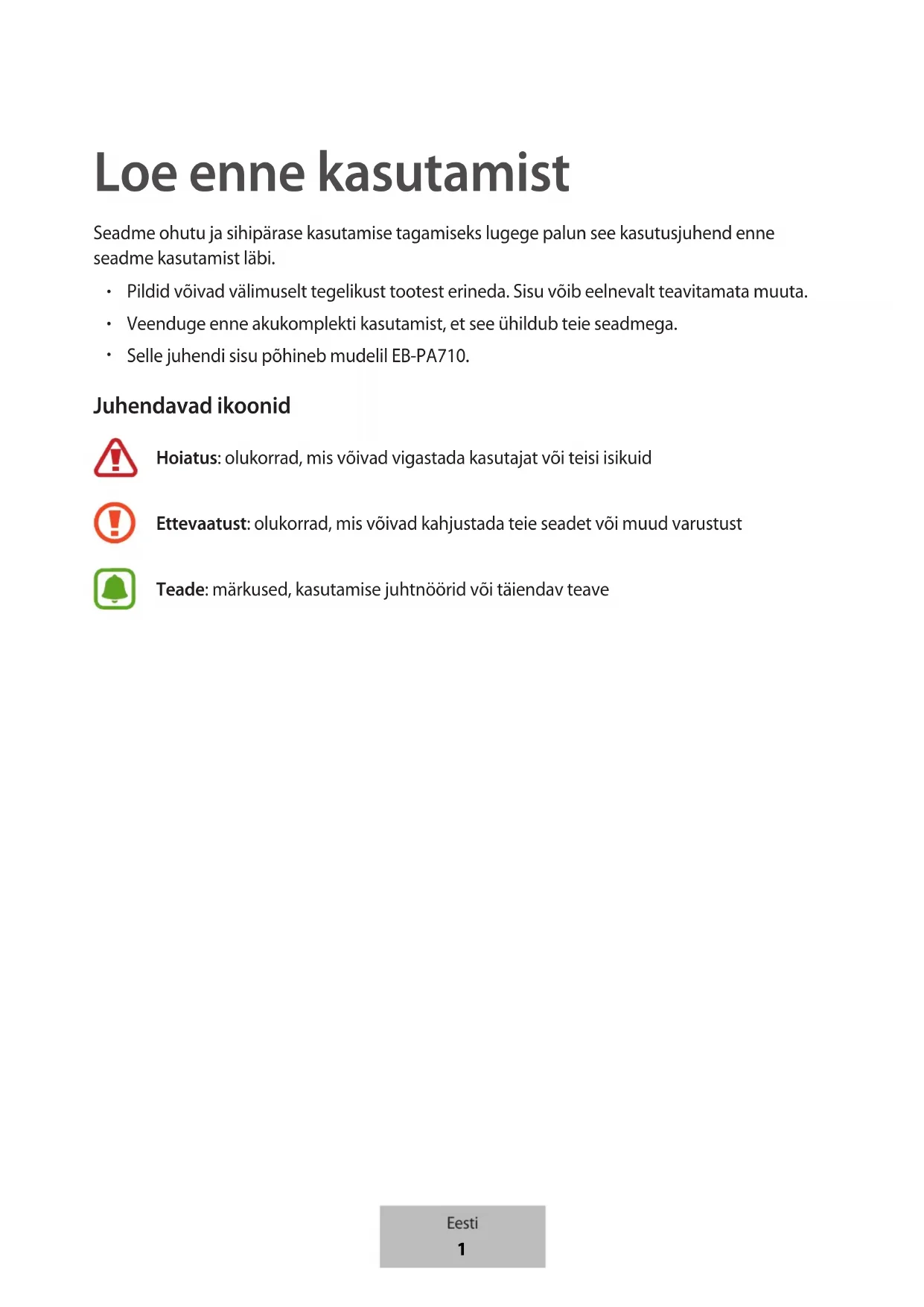 Selle juhendi sisu põhineb mudelil EB-PA710. Juhendavad ikoonid Hoiatus: olukorrad, mis võivad vigastada kasutajat või teisi isikuid Ettevaatust: olukorrad, mis võivad kahjustada teie seadet või muud varustust Teade: märkused, kasutamise juhtnöörid või täiendav teave Eesti