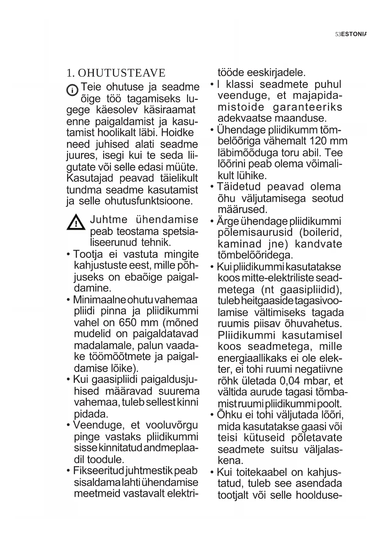 - Kui pliidikummi kasutatakse koos mitte-elektriliste sead- metega (nt gaasipliidid), tuleb heitgaaside tagasivoo- lamise vältimiseks tagada ruumis piisav õhuvahetus. Pliidikummi kasutamisel koos seadmetega, mille energiaallikaks ei ole elek- ter, ei tohi ruumi negatiivne rõhk ületada 0,04 mbar, et vältida aurude tagasi tõmba- mist ruumi pliidikummi poolt.