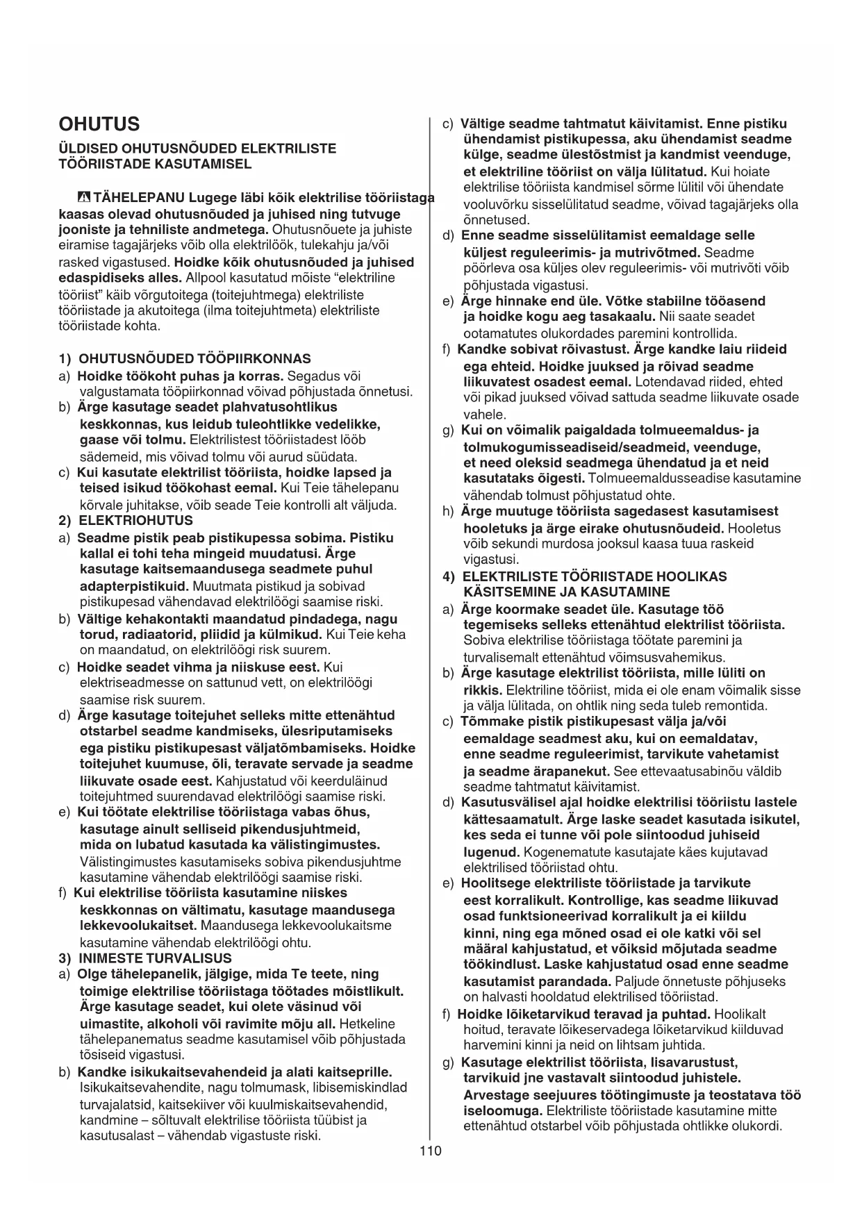 a) Ärge koormake seadet üle. Kasutage töö tegemiseks selleks ettenähtud elektrilist tööriista. Sobiva elektrilise tööriistaga töötate paremini ja turvalisemalt ettenähtud võimsusvahemikus. b) Ärge kasutage elektrilist tööriista, mille lüliti on rikkis. Elektriline tööriist, mida ei ole enam võimalik sisse ja välja lülitada, on ohtlik ning seda tuleb remontida. c) Tõmmake pistik pistikupesast välja ja/või eemaldage seadmest aku, kui on eemaldatav, enne seadme reguleerimist, tarvikute vahetamist ja seadme ärapanekut. See ettevaatusabinõu väldib seadme tahtmatut käivitamist. d) Kasutusvälisel ajal hoidke elektrilisi tööriistu lastele kättesaamatult. Ärge laske seadet kasutada isikutel, kes seda ei tunne või pole siintoodud juhiseid lugenud. Kogenematute kasutajate käes kujutavad elektrilised tööriistad ohtu. e) Hoolitsege elektriliste tööriistade ja tarvikute eest korralikult. Kontrollige, kas seadme liikuvad osad funktsioneerivad korralikult ja ei kiildu kinni, ning ega mõned osad ei ole katki või sel määral kahjustatud, et võiksid mõjutada seadme töökindlust. Laske kahjustatud osad enne seadme kasutamist parandada. Paljude õnnetuste põhjuseks on halvasti hooldatud elektrilised tööriistad. f) Hoidke lõiketarvikud teravad ja puhtad. Hoolikalt hoitud, teravate lõikeservadega lõiketarvikud kiilduvad harvemini kinni ja neid on lihtsam juhtida. g) Kasutage elektrilist tööriista, lisavarustust, tarvikuid jne vastavalt siintoodud juhistele. Arvestage seejuures töötingimuste ja teostatava töö iseloomuga. Elektriliste tööriistade kasutamine mitte ettenähtud otstarbel võib põhjustada ohtlikke olukordi. OHUTUS