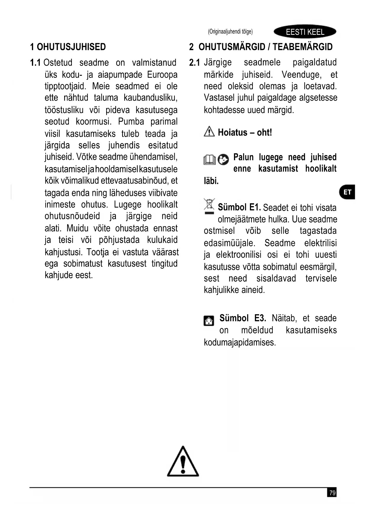 Järgige seadmele paigaldatud märkide juhiseid. Veenduge, et need oleksid olemas ja loetavad. Vastasel juhul paigaldage algsetesse kohtadesse uued märgid. Hoiatus – oht! Palun lugege need juhised enne kasutamist hoolikalt läbi. Sümbol E1. Seadet ei tohi visata olmejäätmete hulka. Uue seadme ostmisel võib selle tagastada edasimüüjale. Seadme elektrilisi ja elektroonilisi osi ei tohi uuesti kasutusse võtta sobimatul eesmärgil, sest need sisaldavad tervisele kahjulikke aineid. Sümbol E3. Näitab, et seade on mõeldud kasutamiseks kodumajapidamises.80 EESTI KEEL (Originaaljuhendi tõlge)
