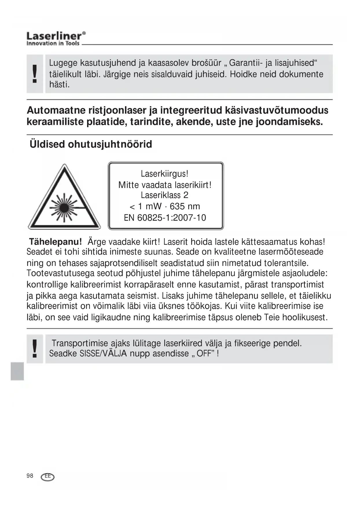 Automaatne ristjoonlaser ja integreeritud käsivastuvõtumoodus keraamiliste plaatide, tarindite, akende, uste jne joondamiseks. Üldised ohutusjuhtnöörid Tähelepanu! Ärge vaadake kiirt! Laserit hoida lastele kättesaamatus kohas! Seadet ei tohi sihtida inimeste suunas. Seade on kvaliteetne lasermõõteseade ning on tehases sajaprotsendiliselt seadistatud siin nimetatud tolerantsile. Tootevastutusega seotud põhjustel juhime tähelepanu järgmistele asjaoludele: kontrollige kalibreerimist korrapäraselt enne kasutamist, pärast transportimist ja pikka aega kasutamata seismist. Lisaks juhime tähelepanu sellele, et täielikku kalibreerimist on võimalik läbi viia üksnes töökojas. Kui viite kalibreerimise ise läbi, on see vaid ligikaudne ning kalibreerimise täpsus oleneb Teie hoolikusest. Laserkiirgus! Mitte vaadata laserikiirt! Laseriklass 2 < 1 mW · 635 nm EN 60825-1:2007-10 Transportimise ajaks lülitage laserkiired välja ja fikseerige pendel. Seadke SISSE/VÄLJA nupp asendisse „OFF”!