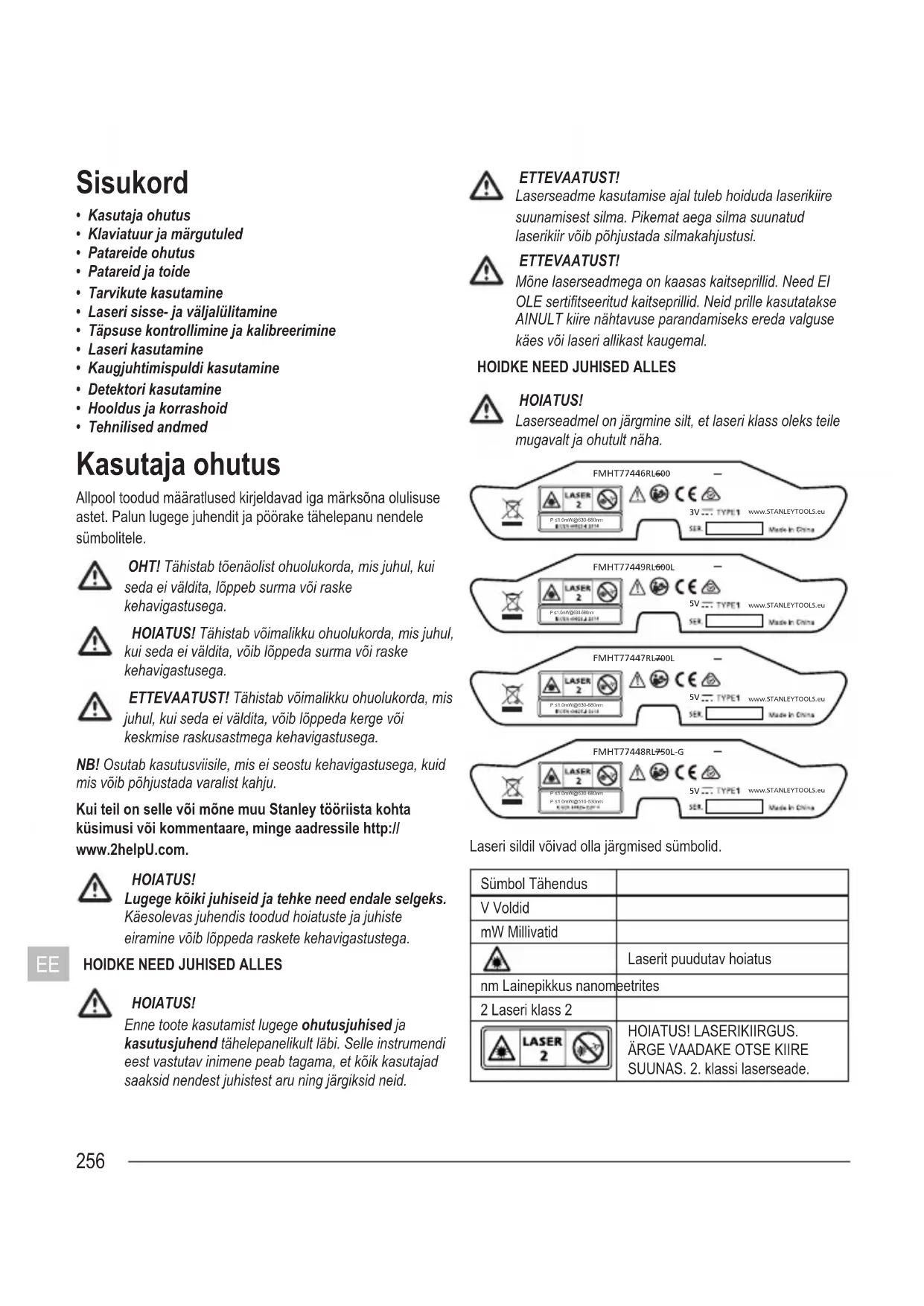 - Kalibreerimise kontrolli ja teisi hooldustöid võivad teha ainult STANLEY volitatud teeninduskeskused.266