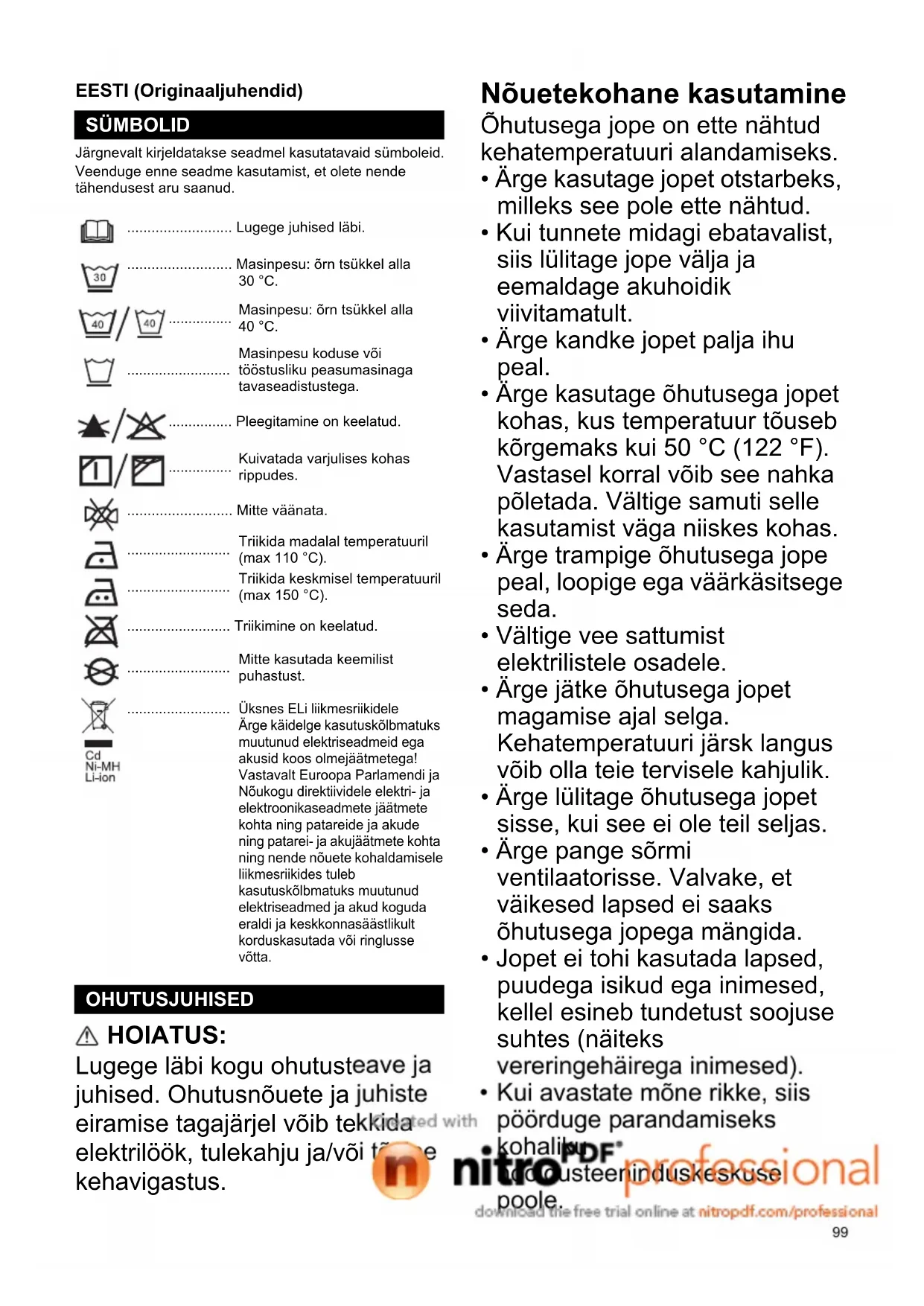 Üksnes ELi liikmesriikidele Ärge käidelge kasutuskõlbmatuks muutunud elektriseadmeid ega akusid koos olmejäätmetega! Vastavalt Euroopa Parlamendi ja Nõukogu direktiividele elektri- ja elektroonikaseadmete jäätmete kohta ning patareide ja akude ning patarei- ja akujäätmete kohta ning nende nõuete kohaldamisele liikmesriikides tuleb kasutuskõlbmatuks muutunud elektriseadmed ja akud koguda eraldi ja keskkonnasäästlikult korduskasutada või ringlusse võtta. OHUTUSJUHISED100