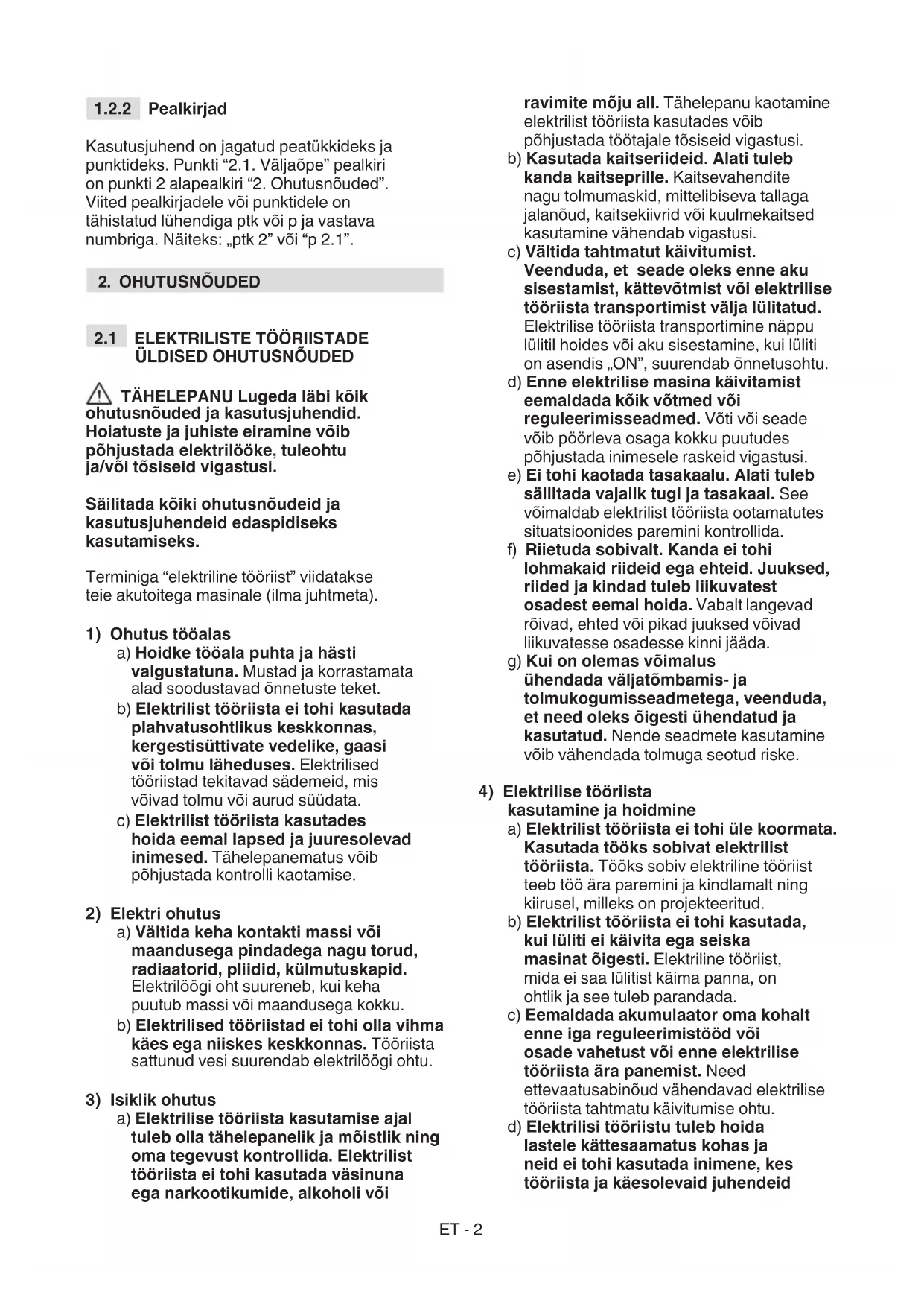 TÄHELEPANU Lugeda läbi kõik ohutusnõuded ja kasutusjuhendid. Hoiatuste ja juhiste eiramine võib põhjustada elektrilööke, tuleohtu ja/või tõsiseid vigastusi. Säilitada kõiki ohutusnõudeid ja kasutusjuhendeid edaspidiseks kasutamiseks. Terminiga “elektriline tööriist” viidatakse teie akutoitega masinale (ilma juhtmeta).