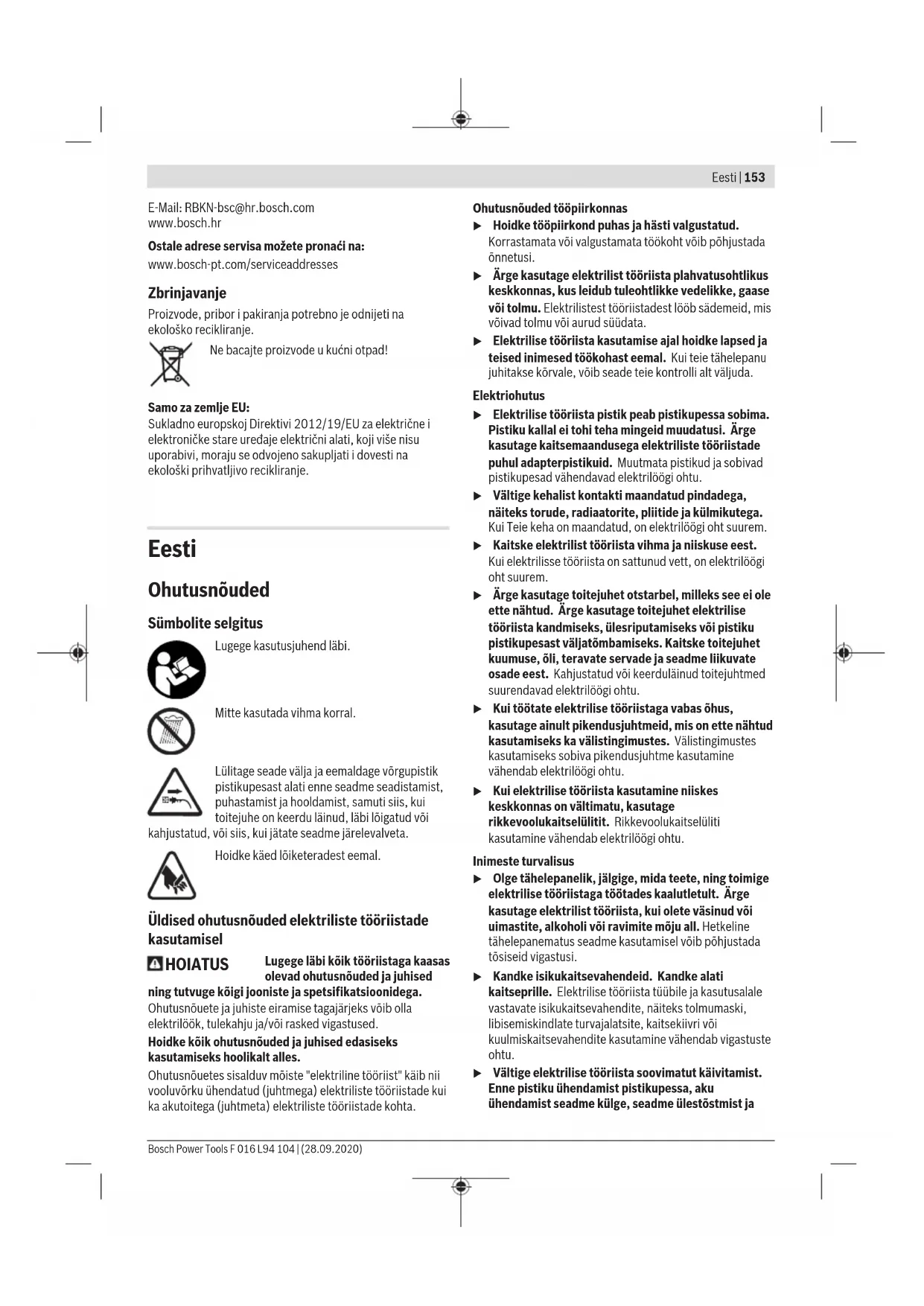 Rukovanje u Vodite računa o mrežnom naponu! Napon strujnog izvora mora se podudarati s informacijama na označnoj pločici uređaja. Uključivanje/isključivanje (vidi slike C i D) Radi uključivanja najprije pritisnite uklopni zapor (3) i držite ga pritisnutog. Zatim pritisnite sklopku za uključivanje/ isključivanje (2) i držite je pritisnutom. Bosch Power Tools F 016 L94 104 | (28.09.2020)152 | Hrvatski Radi isključivanja pustite uklopni zapor (3), a zatim sklopku za uključivanje/isključivanje (2). Rad sa škarama za živicu (vidi sliku E) Jednoliko pomičite škare za živicu naprijed po reznoj liniji. Dvostrani nosač noža omogućava rezanje u oba smjera ili njišućim pokretima s jedne na drugu stranu. Najprije orežite strane živice, a zatim gornji rub. Kako bi se dobile ravne strane, preporučujemo rezanje odozdo prema gore u smjeru rasta. U slučaju rezanja odozgo prema dolje tanje grane pomicale bi se prema van, čime mogu nastati prorijeđena mjesta ili rupe. Kako bi se na kraju jednoliko orezao gornji rub, napnite uzicu po čitavoj duljini živice na potrebnoj visini. Vodite računa o tome da se ne prerežu predmeti kao što su npr. žice. Noževi ili pogon mogu se oštetiti. Otklanjanje pogrešaka Simptom Mogući uzrok Rješenje Škare za živicu ne rade Ne postoji mrežni napon Provjerite i uključite Mrežna utičnica je neispravna Uporabite drugu utičnicu Mrežni kabel je oštećen Provjerite mrežni kabel i u slučaju oštećenja obratite se servisnoj službi Produžni kabel je oštećen Provjerite produžni kabel i zamijenite ga ako je oštećen Osigurač se aktivirao Zamijenite osigurač Škare za živicu rade s prekidima Unutarnje ožičenje vrtnog uređaja je neispravno Obratite se servisnoj službi Sklopka za uključivanje/isključivanje je neispravna Obratite se servisnoj službi Motor radi, ali noževi miruju Unutarnja pogreška Obratite se servisnoj službi Nož se grije Nož je tup Zatražite oštrenje nosača noža Nož ima ureze Zatražite provjeru nosača noža Preveliko trenje zbog nedovoljnog podmazivanja Poprskajte mazivim uljem Jake vibracije/buka Vrtni uređaj je neispravan Obratite se servisnoj službi Održavanje i servisiranje Održavanje, čišćenje i skladištenje u Prije svih radova na proizvodu izvucite mrežni utikač iz utičnice. u Održavajte proizvod čistim kako biste mogli dobro i sigurno raditi. Ne stavljajte druge predmete na vrtni uređaj. Održavajte proizvod i ventilacijske proreze čistima kako biste mogli dobro i sigurno raditi. Nikada ne prskajte proizvod vodom. Nikada ne uranjajte proizvod u vodu. Skladištite proizvod na sigurnom, suhom mjestu i izvan dosega djece. Ne stavljajte druge predmete na proizvod. Pobrinite se za to da su sve matice, svornjaci i vijci učvršćeni kako bi bilo moguće sigurno raditi proizvodom. Provjerite proizvod i radi sigurnosti zamijenite istrošene ili oštećene dijelove. Pobrinite se za to da je rezervne dijelove proizvela tvrtka Bosch. Servisna služba i savjeti o uporabi Naša servisna služba će odgovoriti na vaša pitanja o popravku i održavanju vašeg proizvoda, kao i o rezervnim dijelovima. Crteže u rastavljenom obliku i informacije o rezervnim dijelovima možete naći i na našoj adresi: www.bosch-pt.com Tim Bosch savjetnika o uporabi rado će odgovoriti na vaša pitanja o našim proizvodima i njihovom priboru. U slučaju upita ili naručivanja rezervnih dijelova, molimo vas obavezno navedite 10‑znamenkasti kataloški broj s tipske pločice proizvoda. Hrvatski Robert Bosch d.o.o PT/SHR-BSC Kneza Branimira 22 10040 Zagreb Tel.: +385 12 958 051 Fax: +385 12 958 050 F 016 L94 104 | (28.09.2020) Bosch Power ToolsEesti | 153 E-Mail: RBKN-bsc@hr.bosch.com www.bosch.hr Ostale adrese servisa možete pronaći na: www.bosch-pt.com/serviceaddresses Zbrinjavanje Proizvode, pribor i pakiranja potrebno je odnijeti na ekološko recikliranje. Ne bacajte proizvode u kućni otpad! Samo za zemljeEU: Sukladno europskoj Direktivi 2012/19/EU za električne i elektroničke stare uređaje električni alati, koji više nisu uporabivi, moraju se odvojeno sakupljati i dovesti na ekološki prihvatljivo recikliranje. Eesti Ohutusnõuded Sümbolite selgitus Lugege kasutusjuhend läbi. Mitte kasutada vihma korral. Lülitage seade välja ja eemaldage võrgupistik pistikupesast alati enne seadme seadistamist, puhastamist ja hooldamist, samuti siis, kui toitejuhe on keerdu läinud, läbi lõigatud või kahjustatud, või siis, kui jätate seadme järelevalveta. Hoidke käed lõiketeradest eemal. Üldised ohutusnõuded elektriliste tööriistade kasutamisel HOIATUS Lugege läbi kõik tööriistaga kaasas olevad ohutusnõuded ja juhised ning tutvuge kõigi jooniste ja spetsifikatsioonidega. Ohutusnõuete ja juhiste eiramise tagajärjeks võib olla elektrilöök, tulekahju ja/või rasked vigastused. Hoidke kõik ohutusnõuded ja juhised edasiseks kasutamiseks hoolikalt alles. Ohutusnõuetes sisalduv mõiste "elektriline tööriist" käib nii vooluvõrku ühendatud (juhtmega) elektriliste tööriistade kui ka akutoitega (juhtmeta) elektriliste tööriistade kohta. Ohutusnõuded tööpiirkonnas u Hoidke tööpiirkond puhas ja hästi valgustatud. Korrastamata või valgustamata töökoht võib põhjustada õnnetusi. u Ärge kasutage elektrilist tööriista plahvatusohtlikus keskkonnas, kus leidub tuleohtlikke vedelikke, gaase või tolmu. Elektrilistest tööriistadest lööb sädemeid, mis võivad tolmu või aurud süüdata. u Elektrilise tööriista kasutamise ajal hoidke lapsed ja teised inimesed töökohast eemal. Kui teie tähelepanu juhitakse kõrvale, võib seade teie kontrolli alt väljuda. Elektriohutus u Elektrilise tööriista pistik peab pistikupessa sobima. Pistiku kallal ei tohi teha mingeid muudatusi. Ärge kasutage kaitsemaandusega elektriliste tööriistade puhul adapterpistikuid. Muutmata pistikud ja sobivad pistikupesad vähendavad elektrilöögi ohtu. u Vältige kehalist kontakti maandatud pindade