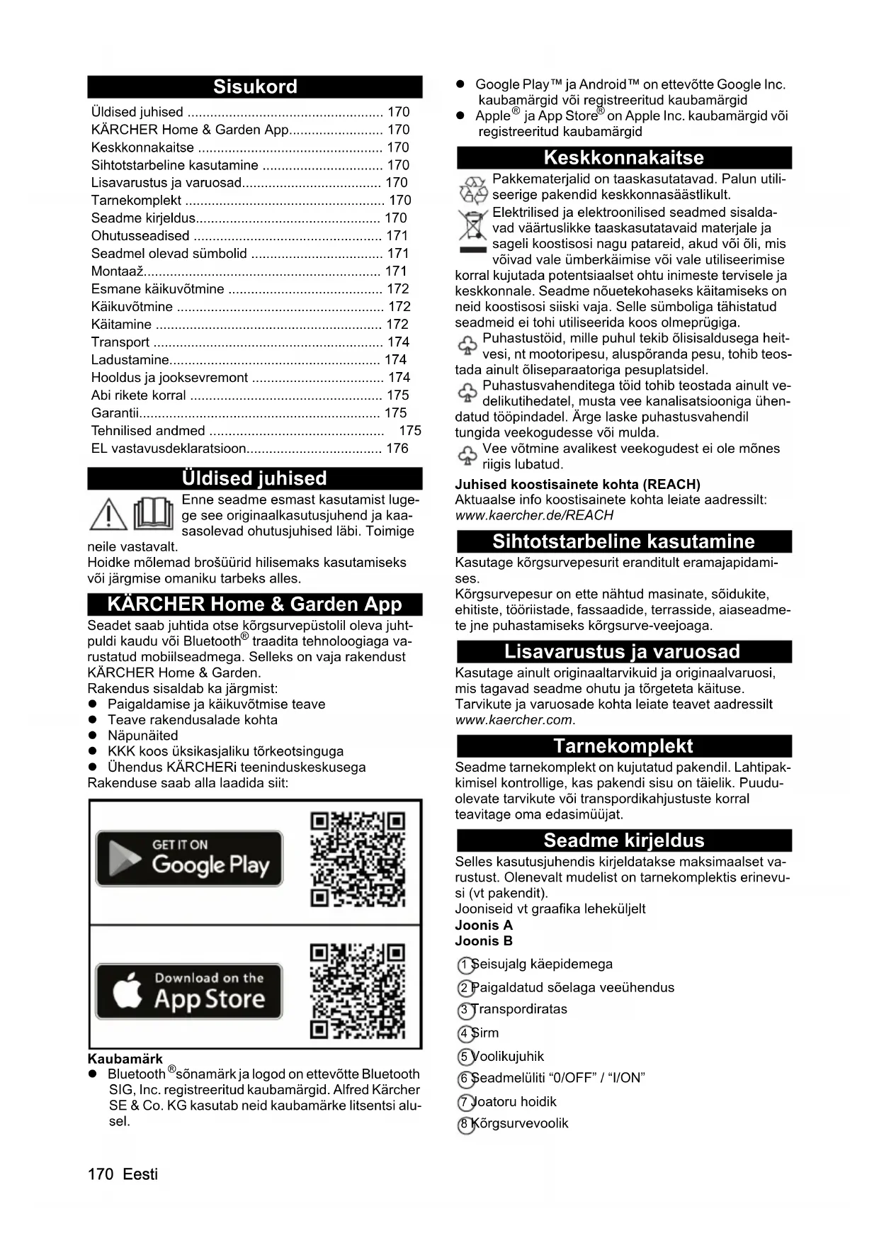 traadita tehnoloogiaga va- rustatud mobiilseadmega. Selleks on vaja rakendust KÄRCHER Home & Garden. Rakendus sisaldab ka järgmist: Paigaldamise ja käikuvõtmise teave Teave rakendusalade kohta Näpunäited KKK koos üksikasjaliku tõrkeotsinguga Ühendus KÄRCHERi teeninduskeskusega Rakenduse saab alla laadida siit: Kaubamärk Bluetooth