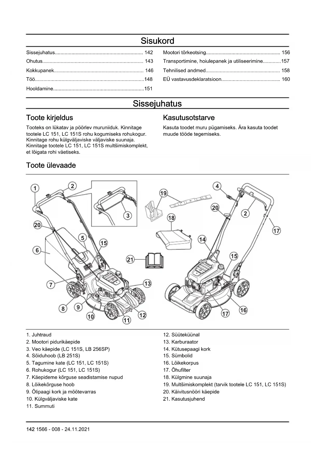 142 1566 - 008 - 24.11.2021Sümbolid tootel HOIATUS! Ole ettevaatlik ja kasuta toodet õigesti. Toode võib põhjustada kasutaja või kõrvaliste isikute ohtliku kehavigastuse või surma. Enne seadme kasutamist loe kasutusjuhend põhjalikult läbi, et kõik juhised oleksid täiesti arusaadavad. Olge ettevaatlik - lenduvad esemed ning tagasipõrkumise oht. Teised inimesed ja loomad peavad viibima tööalast ohutus kauguses. Hoiatus! Hoidke käed ja jalad pöörlevast terast eemal. Hoiatus! Hoidke käed ja jalad pöörlevatest osadest eemal. Enne seadme remontimist või hooldamist seisake mootor ja eemaldage süütejuhe. See toode vastab kehtivatele EÜ direktiividele. Ümbritsevasse keskkonda leviv müra vastavalt Euroopa Ühenduse direktiivile. Seadme müratase on ära toodud tehniliste andmete peatükis ja etiketil. Tuleoht. Ärge hingake sisse heitgaase. Mootori heitgaasid sisaldavad vingugaasi: lõhnatut, mürgist ja väga ohtlikku gaasi. Ärge käivitage mootorit siseruumis ega suletud alal. Kuum pind. Enne toote käivitamist täida mootor õliga. Märkus: Seadmel toodud ülejäänud sümbolid/ tähised viitavad teatud kommertsvaldkondade sertifitseerimisnõuetele. Tootevastutus Tootevastutusseaduste alusel ei vastuta me tootest tingitud kahjustuste eest, kui: