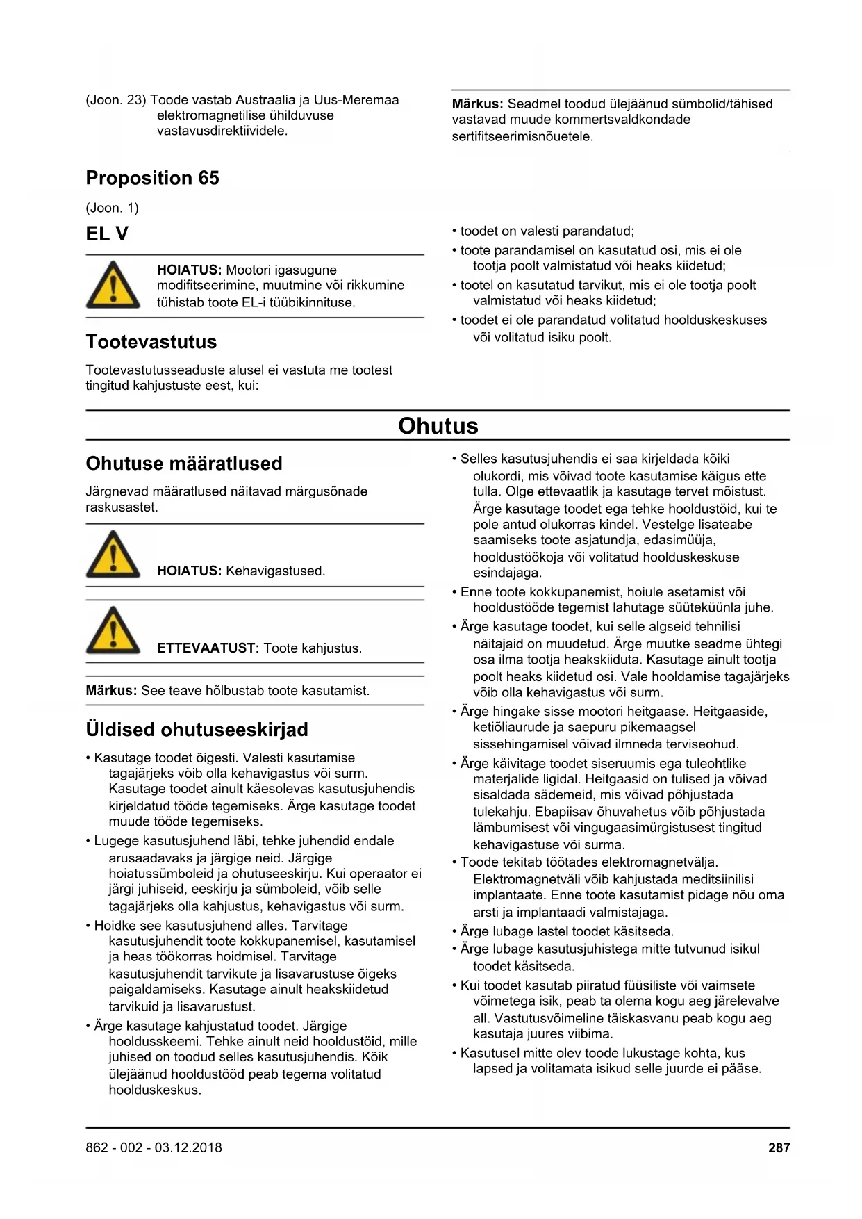 Sümbolid tootel (Joon. 3) Hoiatus (Joon. 4) Lugege läbi käesolev kasutusjuhend (Joon. 5) Kandke heakskiidetud peakaitset, kõrvaklappe ja silmade kaitset (Joon. 6) Kandke heakskiidetud kaitsekindaid (Joon. 7) See seade vastab kehtivatele EÜ direktiividele. (Joon. 8) Helitugevuse tase (Joon. 9) Ketipidur, rakendamata (vasakul). Ketipidur, rakendatud (paremal). (Joon. 10) Õhuklapp (Joon. 11) Kütusepump (Joon. 12) Kütuse lisamine (Joon. 13) Ketiõli lisamine. (Joon. 14) Toode vastab kehtivatele EAC direktiividele. (Joon. 15) Toode vastab kehtivatele Ukraina direktiividele (Joon. 16) Toode vastab kehtivatele Korea direktiividele. (Joon. 17) Toode vastab kehtivatele Jaapani direktiividele. (Joon. 18) Müratase (Joon. 19) Hoidke toodet kindlalt mõlema käega (Joon. 20) Ärge kasutage seadet ühe käega (Joon. 21) Ärge puudutage juhtplaadi nina (Joon. 22) Jälgi tagasilööki 286 862 - 002 - 03.12.2018(Joon. 23) Toode vastab Austraalia ja Uus-Meremaa elektromagnetilise ühilduvuse vastavusdirektiividele. Märkus: Seadmel toodud ülejäänud sümbolid/tähised vastavad muude kommertsvaldkondade sertifitseerimisnõuetele. Proposition 65 (Joon. 1) EL V HOIATUS: Mootori igasugune modifitseerimine, muutmine või rikkumine tühistab toote EL-i tüübikinnituse. Tootevastutus Tootevastutusseaduste alusel ei vastuta me tootest tingitud kahjustuste eest, kui: