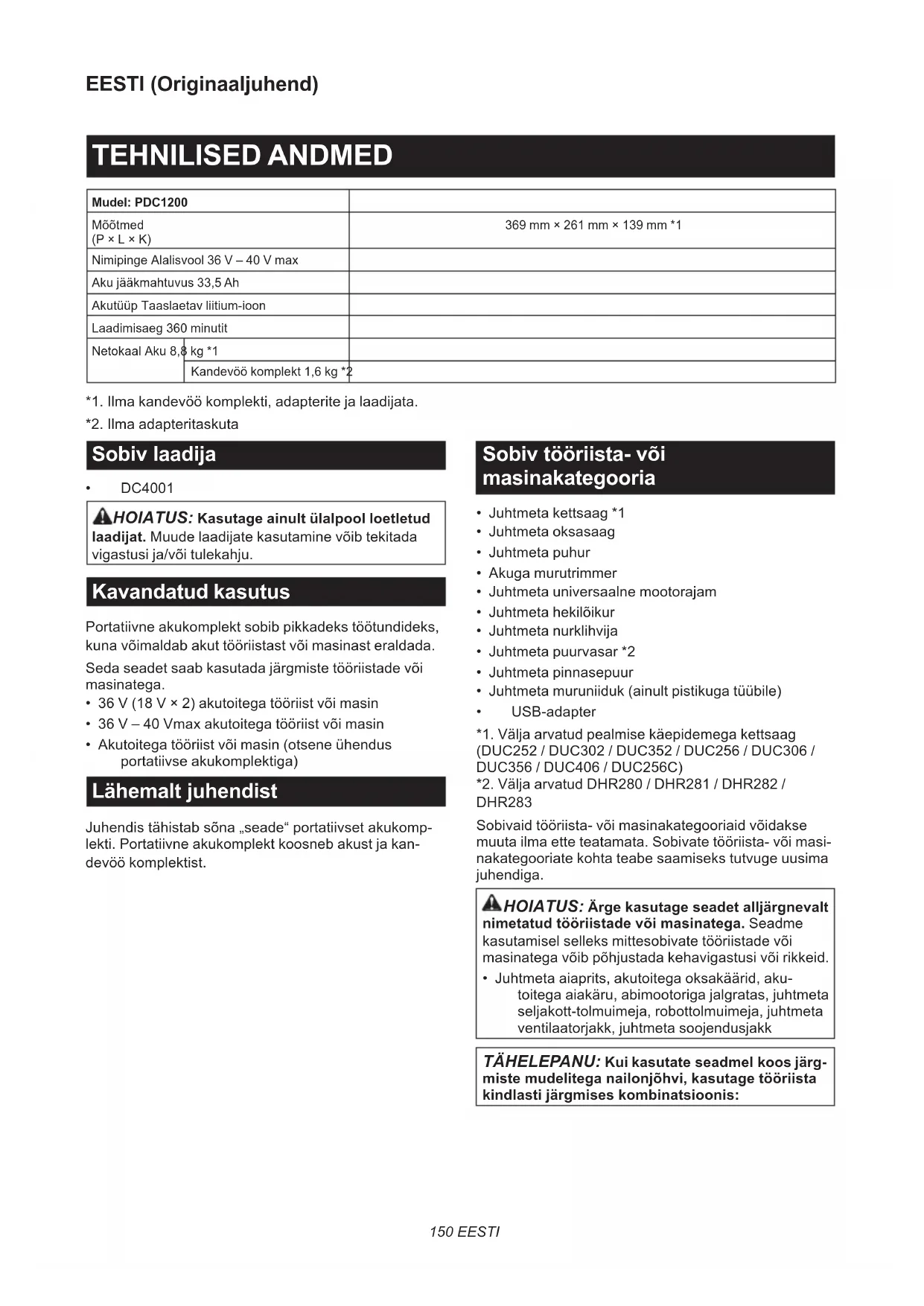 DUC356 / DUC406 / DUC256C) *2. Välja arvatud DHR280 / DHR281 / DHR282 / DHR283 Sobivaid tööriista- või masinakategooriaid võidakse muuta ilma ette teatamata. Sobivate tööriista- või masi- nakategooriate kohta teabe saamiseks tutvuge uusima juhendiga. HOIATUS: Ärge kasutage seadet alljärgnevalt nimetatud tööriistade või masinatega. Seadme kasutamisel selleks mittesobivate tööriistade või masinatega võib põhjustada kehavigastusi või rikkeid.