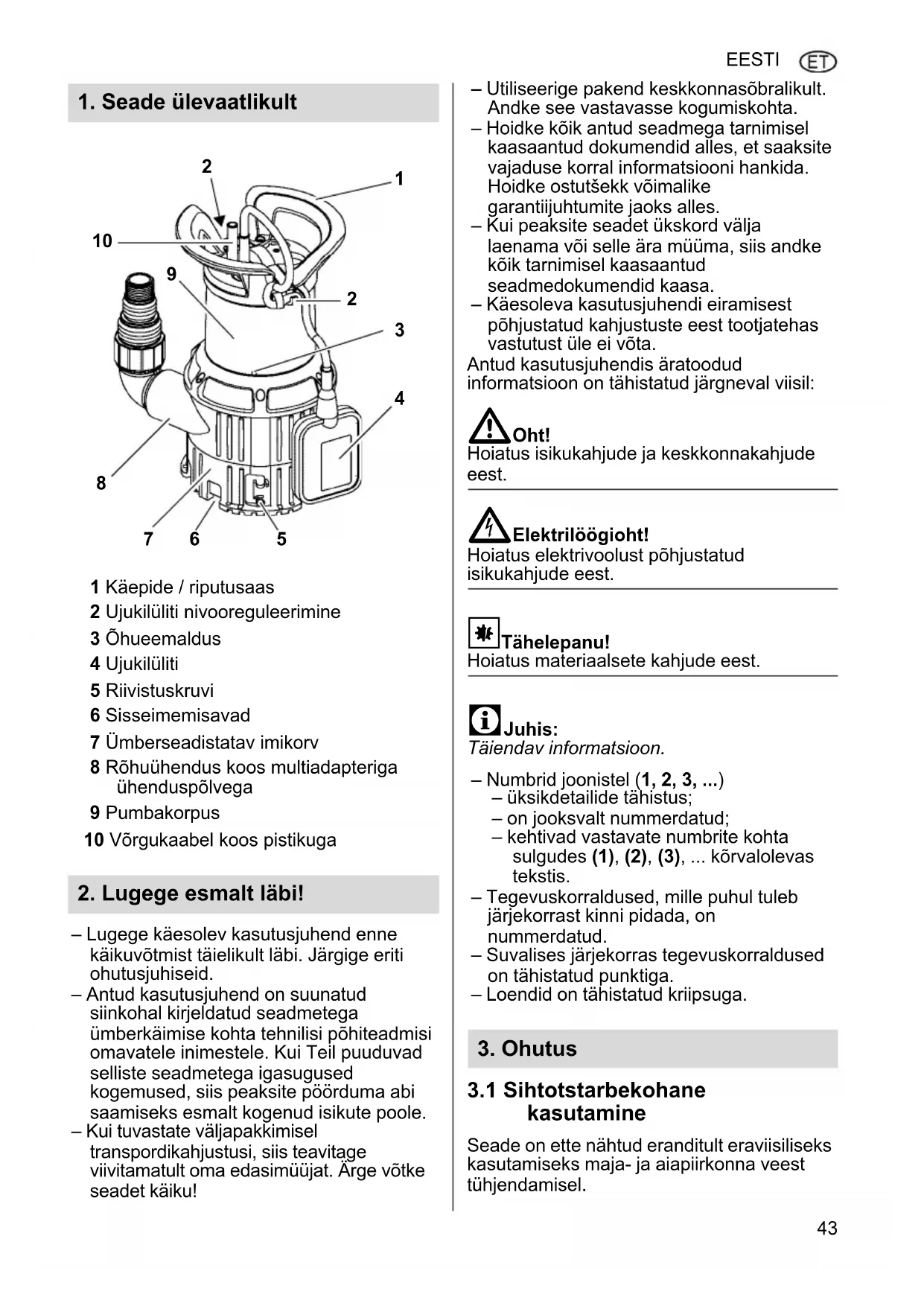 – Järgige antud seadme kasutamisel inimeste ohustamise või materiaalsete kahjude välistamiseks alljärgnevaid ohutusjuhiseid. – Järgige sukelpumpade kohta kehtivaid seadusega sätestatud direktiive või õnnetuste vältimise eeskirju. – Pidage seadet ujumisbasseinides või aiatiikides ning nende kaitsepiirkonnas kasutades kinni DIN VDE 0100 -702, -738 nõuetest. Järgige lisaks sellele vajadusel ka kohalikke eeskirju. – Seade tuleb kaitsta rikkevoolulülitiga (RCD), mille mõõdetud rikkevool on maksimaalselt 30 mA. AÜldine oht! Ärge käitage seadet, kui inimesed puutuvad pumbatava vedelikuga kokku (nt. ujumisbasseinis või aiatiigis)! Sukelpumpade käitamisel valitsevad põhimõtteliselt alljärgnevalt äratoodud jääkohud – neid pole võimalik ka ohutusmeetmetega täielikult kõrvaldada. AOht ümbrusmõjude tõttu! Ärge kasutage seadet plahvatusohtlikes ruumides ega põlevate vedelike või gaaside läheduses! AOht kuuma vee tõttu! Kui halbade rõhutingimuste või defektse rõhulüliti tõttu ei saavutata rõhulülitil ettenähtud väljalülitusrõhku, siis võib vesi seadme sisemuses internse ringluse toimel kuumeneda. Seetõttu võivad seadmel ja ühendustorustikel tekkida kahjustused ning ebatihedused, mille kaudu esineb kuuma vee väljatungimise võimalus. Põletusoht! Käitage seadet suletud rõhutorustiku vastu max 5 minutit. Ühendage seade vooluvõrgust lahti ja laske maha jahtuda. Laske süsteem enne uuesti töössevõtmist oskuspersonalil laitmatu talitluse suhtes üle kontrollida. BOht elektrivoolu tõttu! Ärge haarake võrgupistikust märgade kätega kinni! Tõmmake võrgupistik alati välja pistikust, mitte kaablist hoides. Ühendust tohib teostada ainult kaitsekontakt-pistikupesadega, mis on asjatundlikult installeeritud, maandatud ning üle kontrollitud. Võrgupinge ja kaitse peavad vastama tehnilistele andmetele. Tõstke seadet üles ja transportige seda alati käepidemest, mitte kunagi ühenduskaablist ega rõhuvoolikust.45 EESTI Pikenduskaablid peavad olema piisava sooneristlõikega. Kaablitrumlid peavad olema täielikult lahti keritud. Ärge murdke võrgukaablit ja pikenduskaablit kahekorra, ärge tirige ega sõitke üle; kaitske teravate servade, õli ja kuumuse eest. Vedage pikenduskaabel nii, et sel poleks võimalik pumbatavasse vedelikku sattuda. Tõmmake enne seadme kallal töötamist võrgupistik välja. BElektrilöögioht seadme puuduste tõttu! Kontrollige seade, eriti võrgu- ja pikenduskaabel, võrgupistik ning ujukilüliti, enne igakordset käikuvõtmist võimalike kahjustuste suhtes üle. Eluohtlik elektrilöögi tõttu! Ärge remontige seadet ise! Asjatundmatu remontimise korral valitseb oht, et vedelik tungib seadme elektripiirkonda. ATähelepanu! Vältimaks seadme riketest ja puudustest tingitud veekahjustusi nagu nt üleujutused ruumides: Planeerige sobivad kaitsemeetmed, nt: – alarmiseadis või – järelevalvega kogumisbassein. Tootja ei vastuta võimalike kahjude eest, mis on põhjustatud: – seadme mitte sihtotstarbekohasest kasutamisest; – seadme kestevrežiimil ülekoormamisest; – seadme mitte külmumiskindlast käitamisest ja säilitamisest; – seadmel omavoliliste muudatuste läbiviimisest; Elektriseadmete remonti tohib teostada üksnes elektrispetsialist! – tootja poolt kontrollimata ja heakskiitmata varuosade kasutamisest; – ebasobiva installatsioonimaterjali (armatuurid, ühendustorustikud jne) kasutamisest. Sobiv installatsioonimaterjal: – rõhukindel (vähemalt 10 bar) – soojuskindel (vähemalt 100 °C)