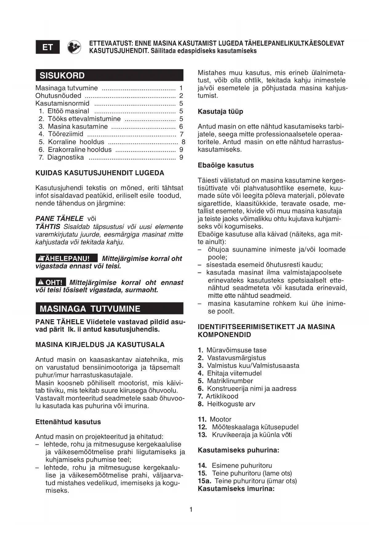 Antud masin on kaasaskantav aiatehnika, mis on varustatud bensiinimootoriga ja täpsemalt puhur/imur harrastuskasutajale. Masin koosneb põhiliselt mootorist, mis käivi- tab tiiviku, mis tekitab suure kiirusega õhuvoolu. Vastavalt monteeritud seadmetele saab õhuvoo- lu kasutada kas puhurina või imurina. Ettenähtud kasutus Antud masin on projekteeritud ja ehitatud: – lehtede, rohu ja mitmesuguse kergekaalulise ja väikesemõõtmelise prahi liigutamiseks ja kuhjamiseks puhumise teel; – lehtede, rohu ja mitmesuguse kergekaalu- lise ja väikesemõõtmelise prahi, väljaarva- tud mistahes vedelikud, imemiseks ja kogu- miseks. Mistahes muu kasutus, mis erineb ülalnimeta- tust, võib olla ohtlik, tekitada kahju inimestele ja/või esemetele ja põhjustada masina kahjus- tumist. Kasutaja tüüp Antud masin on ette nähtud kasutamiseks tarbi- jatele, seega mitte professionaalsetele operaa- toritele. Antud masin on ette nähtud harrastus- kasutamiseks. Ebaõige kasutus Täiesti välistatud on masina kasutamine kerges- tisüttivate või plahvatusohtlike esemete, kuu- made süte või leegita põleva materjali, põlevate sigarettide, klaasitükkide, teravate osade, me- tallist esemete, kivide või muu masina kasutaja ja teiste jaoks võimalikku ohtu kujutava kuhjami- seks või kogumiseks. Ebaõige kasutuse alla käivad (näiteks, aga mit- te ainult): – õhujoa suunamine inimeste ja/või loomade poole; – sisestada esemeid õhutusresti kaudu; – kasutada masinat ilma valmistajapoolsete erinevateks kasutusteks spetsiaalselt ette- nähtud seadmeteta või kasutada erinevaid, mitte ette nähtud seadmeid. – masina kasutamine rohkem kui ühe inime- se poolt.