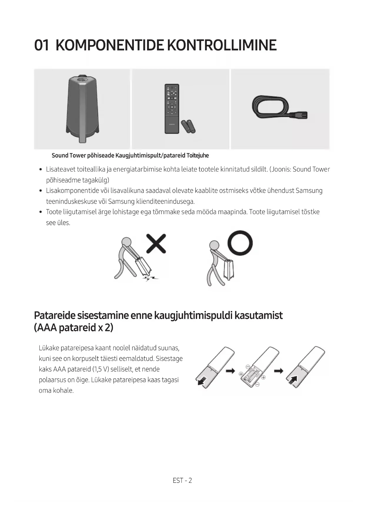 TÄIELIKUST KASUTUSJUHENDIST pääsete juurde Samsungi veebipõhises klienditoekeskuses, skannides QR-koodi. Juhendi vaatamiseks arvutis või mobiilsideseadmes laadige see dokumendi vormingus Samsungi veebisaidilt alla. (http://www.samsung.com/support) Disain ja tehnilised andmed võivad muutuda ilma ette teatamata. Giga Party Audio uus nimi on Sound Tower.EST - iv SISUKORD 01 Komponentide kontrollimine 2 Patareide sisestamine enne kaugjuhtimispuldi kasutamist (AAA patareid x 2) ------------------------- 2 02 Toote ülevaade 3 Sound Tower ülemine paneel ------------------------- 3 Sound Tower tagumine paneel ------------------------- 4 03 Sound Tower ühendamine 6 Elektritoite ühendamine