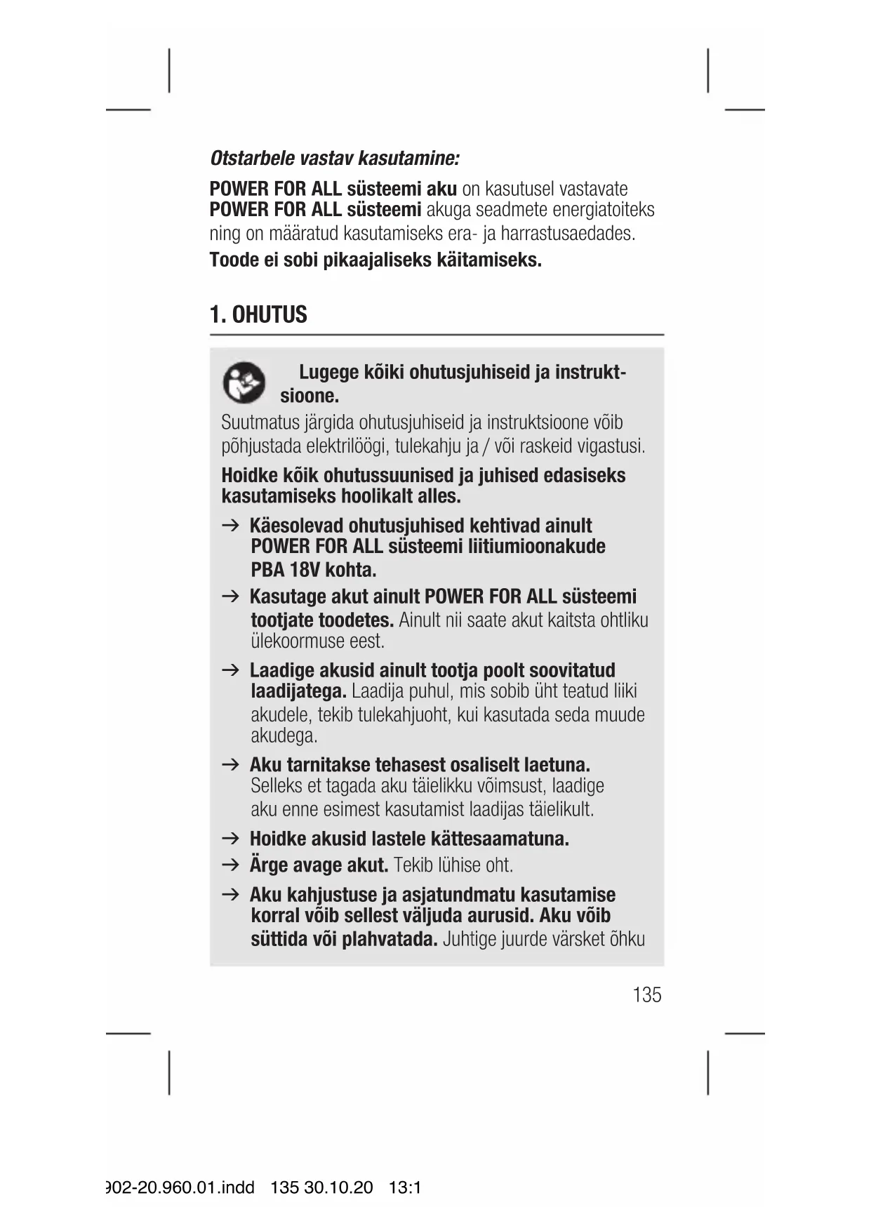 14902-20.960.01.indd 134 30.10.20 13:19Otstarbele vastav kasutamine: POWER FOR ALL süsteemi aku on kasutusel vastavate POWER FOR ALL süsteemi akuga seadmete energiatoiteks ning on määratud kasutamiseks era- ja harrastusaedades. Toode ei sobi pikaajaliseks käitamiseks.