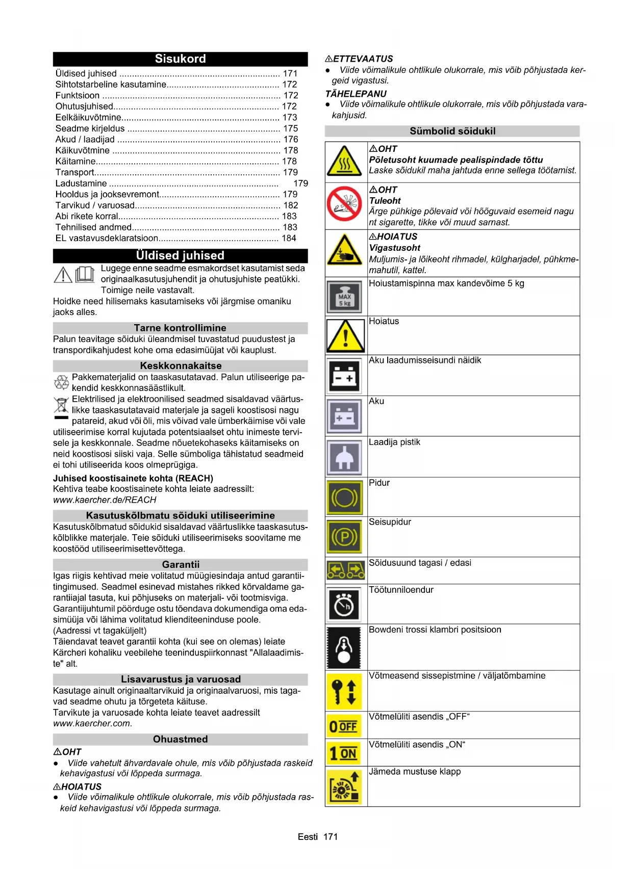 - dB(A)333 KM 85/50 W Bp (1.351-116.0) KM 85/50 W Bp *IN (1.351-118.0) KM 85/50 W Bp Pack (1.351-117.0) KM 85/50 W Bp Pack 2SB (1.351-119.0)Eesti 171 Sisukord Üldised juhised Lugege enne seadme esmakordset kasutamist seda originaalkasutusjuhendit ja ohutusjuhiste peatükki. Toimige neile vastavalt. Hoidke need hilisemaks kasutamiseks või järgmise omaniku jaoks alles. Tarne kontrollimine Palun teavitage sõiduki üleandmisel tuvastatud puudustest ja transpordikahjudest kohe oma edasimüüjat või kauplust. Keskkonnakaitse Pakkematerjalid on taaskasutatavad. Palun utiliseerige pa- kendid keskkonnasäästlikult. Elektrilised ja elektroonilised seadmed sisaldavad väärtus- likke taaskasutatavaid materjale ja sageli koostisosi nagu patareid, akud või õli, mis võivad vale ümberkäimise või vale utiliseerimise korral kujutada potentsiaalset ohtu inimeste tervi- sele ja keskkonnale. Seadme nõuetekohaseks käitamiseks on neid koostisosi siiski vaja. Selle sümboliga tähistatud seadmeid ei tohi utiliseerida koos olmeprügiga. Juhised koostisainete kohta (REACH) Kehtiva teabe koostisainete kohta leiate aadressilt: www.kaercher.de/REACH Kasutuskõlbmatu sõiduki utiliseerimine Kasutuskõlbmatud sõidukid sisaldavad väärtuslikke taaskasutus- kõlblikke materjale. Teie sõiduki utiliseerimiseks soovitame me koostööd utiliseerimisettevõttega. Garantii Igas riigis kehtivad meie volitatud müügiesindaja antud garantii- tingimused. Seadmel esinevad mistahes rikked kõrvaldame ga- rantiiajal tasuta, kui põhjuseks on materjali- või tootmisviga. Garantiijuhtumil pöörduge ostu tõendava dokumendiga oma eda- simüüja või lähima volitatud klienditeeninduse poole. (Aadressi vt tagaküljelt) Täiendavat teavet garantii kohta (kui see on olemas) leiate Kärcheri kohaliku veebilehe teeninduspiirkonnast "Allalaadimis- te" alt. Lisavarustus ja varuosad Kasutage ainult originaaltarvikuid ja originaalvaruosi, mis taga- vad seadme ohutu ja tõrgeteta käituse. Tarvikute ja varuosade kohta leiate teavet aadressilt www.kaercher.com. Ohuastmed OHT ● Viide vahetult ähvardavale ohule, mis võib põhjustada raskeid kehavigastusi või lõppeda surmaga. 몇 HOIATUS ● Viide võimalikule ohtlikule olukorrale, mis võib põhjustada ras- keid kehavigastusi või lõppeda surmaga. 몇 ETTEVAATUS ● Viide võimalikule ohtlikule olukorrale, mis võib põhjustada ker- geid vigastusi. TÄHELEPANU ● Viide võimalikule ohtlikule olukorrale, mis võib põhjustada vara- kahjusid. Sümbolid sõidukil Üldised juhised p. 171
