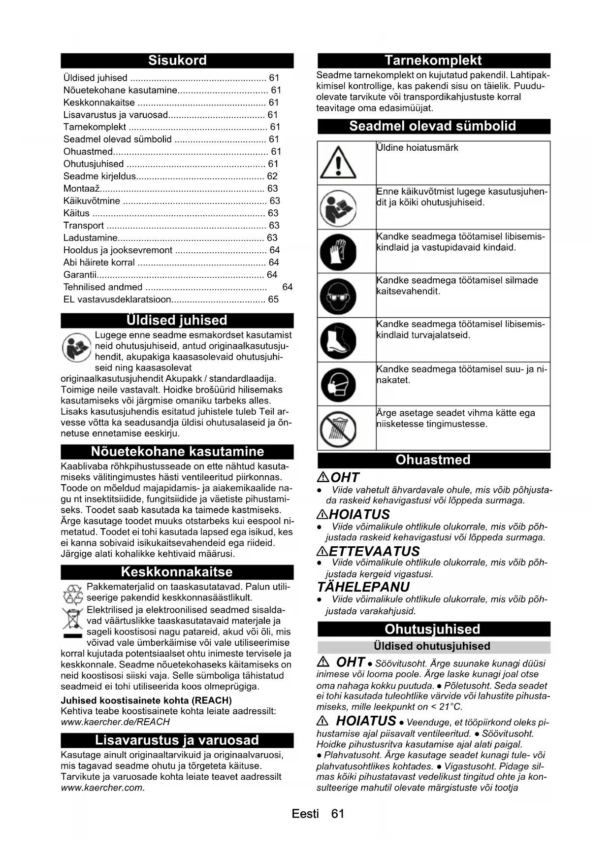 - <2,5 Arbejdstryk (maks.) bar 3 Transportmængde (maks.) l/h 30 Mål og vægt Slangelængde cm 120 Længde på teleskopsprøjtelanse cm 45 - 75 Vægt (uden batteripakke) kg 2,4 Længde x bredde x højde mm 750 x 185 x 365Eesti 61 Sisukord Üldised juhised Lugege enne seadme esmakordset kasutamist neid ohutusjuhiseid, antud originaalkasutusju- hendit, akupakiga kaasasolevaid ohutusjuhi- seid ning kaasasolevat originaalkasutusjuhendit Akupakk / standardlaadija. Toimige neile vastavalt. Hoidke brošüürid hilisemaks kasutamiseks või järgmise omaniku tarbeks alles. Lisaks kasutusjuhendis esitatud juhistele tuleb Teil ar- vesse võtta ka seadusandja üldisi ohutusalaseid ja õn- netuse ennetamise eeskirju. Nõuetekohane kasutamine Kaablivaba rõhkpihustusseade on ette nähtud kasuta- miseks välitingimustes hästi ventileeritud piirkonnas. Toode on mõeldud majapidamis- ja aiakemikaalide na- gu nt insektitsiidide, fungitsiidide ja väetiste pihustami- seks. Toodet saab kasutada ka taimede kastmiseks. Ärge kasutage toodet muuks otstarbeks kui eespool ni- metatud. Toodet ei tohi kasutada lapsed ega isikud, kes ei kanna sobivaid isikukaitsevahendeid ega riideid. Järgige alati kohalikke kehtivaid määrusi. Keskkonnakaitse Pakkematerjalid on taaskasutatavad. Palun utili- seerige pakendid keskkonnasäästlikult. Elektrilised ja elektroonilised seadmed sisalda- vad väärtuslikke taaskasutatavaid materjale ja sageli koostisosi nagu patareid, akud või õli, mis võivad vale ümberkäimise või vale utiliseerimise korral kujutada potentsiaalset ohtu inimeste tervisele ja keskkonnale. Seadme nõuetekohaseks käitamiseks on neid koostisosi siiski vaja. Selle sümboliga tähistatud seadmeid ei tohi utiliseerida koos olmeprügiga. Juhised koostisainete kohta (REACH) Kehtiva teabe koostisainete kohta leiate aadressilt: www.kaercher.de/REACH Lisavarustus ja varuosad Kasutage ainult originaaltarvikuid ja originaalvaruosi, mis tagavad seadme ohutu ja tõrgeteta käituse. Tarvikute ja varuosade kohta leiate teavet aadressilt www.kaercher.com. Tarnekomplekt Seadme tarnekomplekt on kujutatud pakendil. Lahtipak- kimisel kontrollige, kas pakendi sisu on täielik. Puudu- olevate tarvikute või transpordikahjustuste korral teavitage oma edasimüüjat. Seadmel olevad sümbolid Ohuastmed OHT ● Viide vahetult ähvardavale ohule, mis võib põhjusta- da raskeid kehavigastusi või lõppeda surmaga. 몇 HOIATUS ● Viide võimalikule ohtlikule olukorrale, mis võib põh- justada raskeid kehavigastusi või lõppeda surmaga. 몇 ETTEVAATUS ● Viide võimalikule ohtlikule olukorrale, mis võib põh- justada kergeid vigastusi. TÄHELEPANU ● Viide võimalikule ohtlikule olukorrale, mis võib põh- justada varakahjusid. Ohutusjuhised Üldised ohutusjuhised OHT ● Söövitusoht. Ärge suunake kunagi düüsi inimese või looma poole. Ärge laske kunagi joal otse oma nahaga kokku puutuda. ● Põletusoht. Seda seadet ei tohi kasutada tuleohtlike värvide või lahustite pihusta- miseks, mille leekpunkt on < 21°C. 몇 HOIATUS ● Veenduge, et tööpiirkond oleks pi- hustamise ajal piisavalt ventileeritud. ● Söövitusoht. Hoidke pihustusritva kasutamise ajal alati paigal. ● Plahvatusoht. Ärge kasutage seadet kunagi tule- või plahvatusohtlikes kohtades. ● Vigastusoht. Pidage sil- mas kõiki pihustatavast vedelikust tingitud ohte ja kon- sulteerige mahutil olevate märgistuste või tootja Üldised juhised p. 61